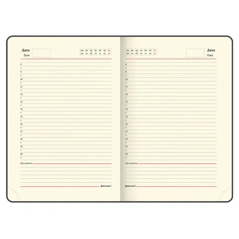 Внутренний блок включает 160 листов тонированной бумаги плотностью 70 г/м2. Каждая страничка имеет перфорированный угол. Благодаря стандартному формату А5 (138х213 мм) ежедневник удобно использовать как в офисе, так и на выездных деловых встречах. Твердая обложка стилизована под фактурную кожу. Подходит для горячего тиснения.