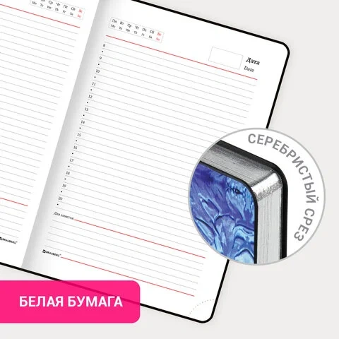 Внутренний блок включает 136 листов белой бумаги плотностью 70 г/м2. Благодаря стандартному формату А5 ежедневник удобно использовать как в офисе, так и на выездных деловых встречах. Интегральная (мягкая) обложка с полноцветной печатью и тиснением серебряной фольгой делает ежедневник неповторимым и запоминающимся.