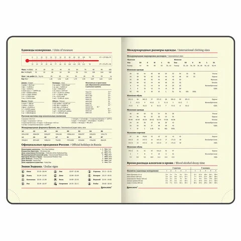 Срез ежедневника фольгирован золотой фольгой, что придает ему особый шарм. Дополнением является закладка-ляссе, с помощью которой можно быстро открыть ежедневник на нужной странице. Помимо прочего ежедневник снабжен справочным материалом. В конце ежедневника есть 3 страницы для записей и заметок.