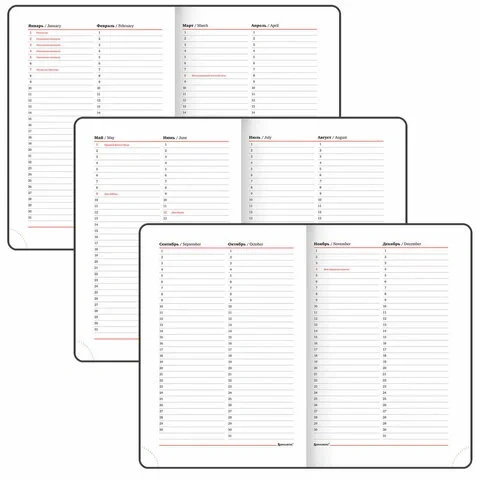 Срез ежедневника окрашен в цвет обложки, что придает ему особый шарм. Дополнением является закладка-ляссе, с помощью которой можно быстро открыть ежедневник на нужной странице. Помимо прочего ежедневник снабжен справочным материалом. В конце ежедневника естья 3 страницы для записей и заметок.