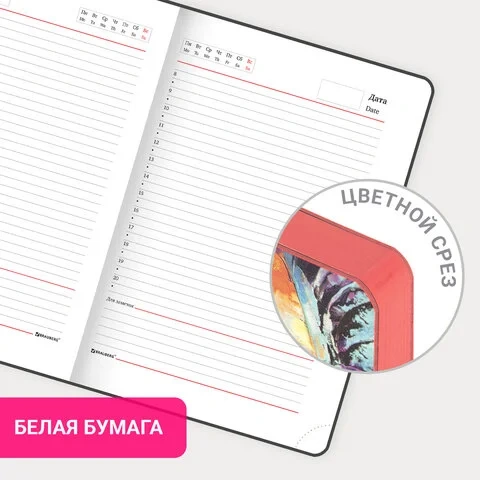 Срез ежедневника прокрашен, что придает ему особый шарм. Дополнением является закладка-ляссе, с помощью которой можно быстро открыть ежедневник на нужной странице. Помимо прочего ежедневник снабжен справочным материалом. В конце ежедневника есть 3 страницы для записей и заметок.