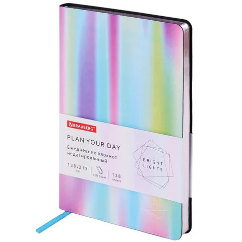 Внутренний блок включает 136 листов белой бумаги плотностью 70 г/м2. Благодаря стандартному формату А5 ежедневник удобно использовать как в офисе, так и на выездных деловых встречах. Интегральная (мягкая) обложка с полноцветной печатью и тиснением серебряной фольгой делает ежедневник неповторимым и запоминающимся.