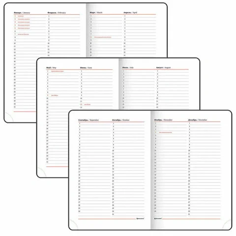 Срез ежедневника прокрашен, что придает ему особый шарм. Дополнением является закладка-ляссе, с помощью которой можно быстро открыть ежедневник на нужной странице. Помимо прочего ежедневник снабжен справочным материалом. В конце ежедневника есть 3 страницы для записей и заметок.
