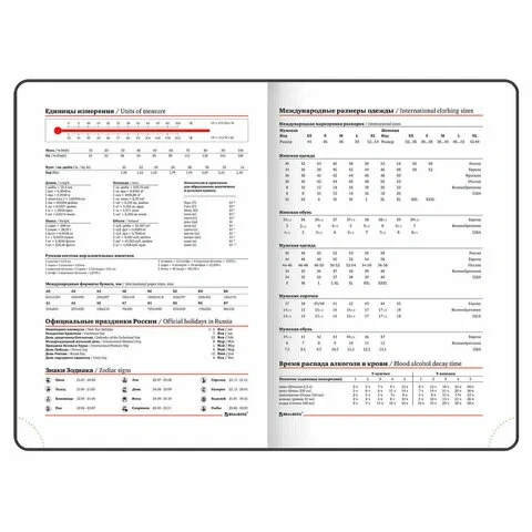 Срез ежедневника прокрашен, что придает ему особый шарм. Дополнением является закладка-ляссе, с помощью которой можно быстро открыть ежедневник на нужной странице. Помимо прочего ежедневник снабжен справочным материалом. В конце ежедневника есть 3 страницы для записей и заметок.