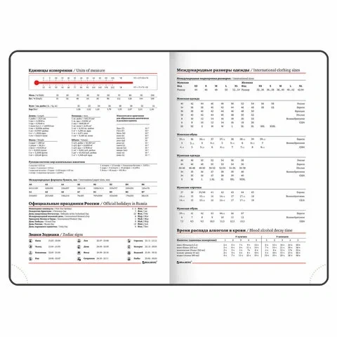 Срез ежедневника прокрашен, что придает ему особый шарм. Дополнением является закладка-ляссе, с помощью которой можно быстро открыть ежедневник на нужной странице. Помимо прочего ежедневник снабжен справочным материалом. В конце ежедневника есть 3 страницы для записей и заметок.