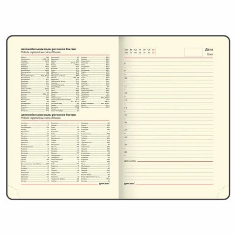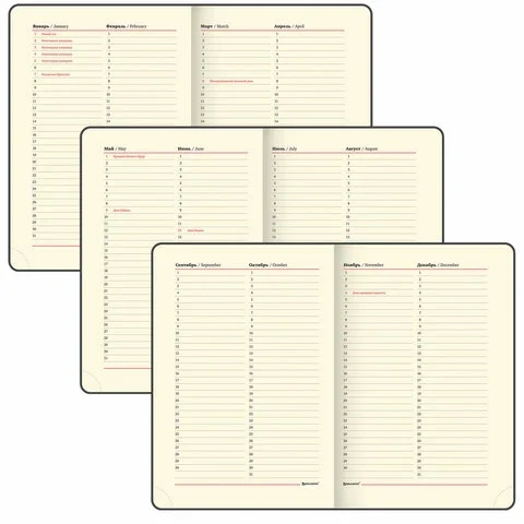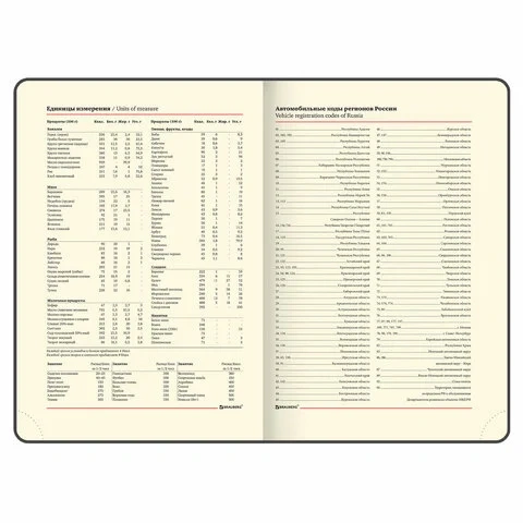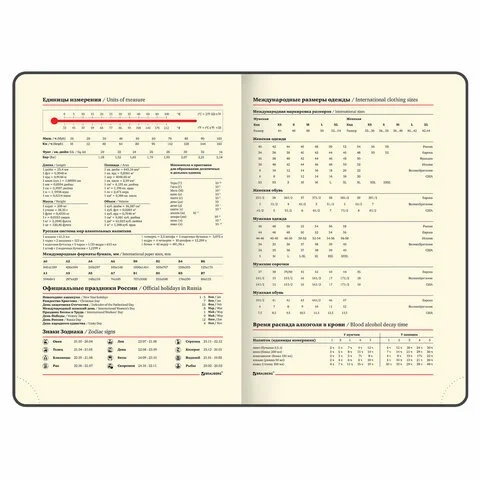 Срез ежедневника окрашен в цвет обложки, что придает ему особый шарм. Дополнением является закладка-ляссе, с помощью которой можно быстро открыть ежедневник на нужной странице. Помимо прочего ежедневник снабжен справочным материалом. В конце ежедневника есть 3 страницы для записей и заметок.