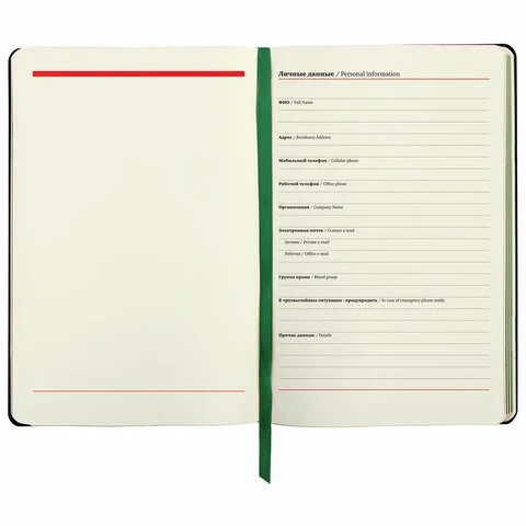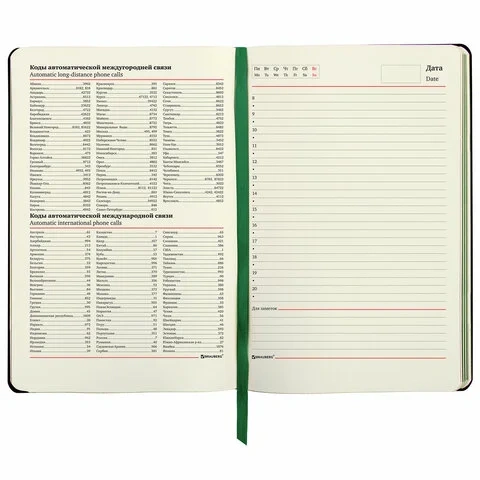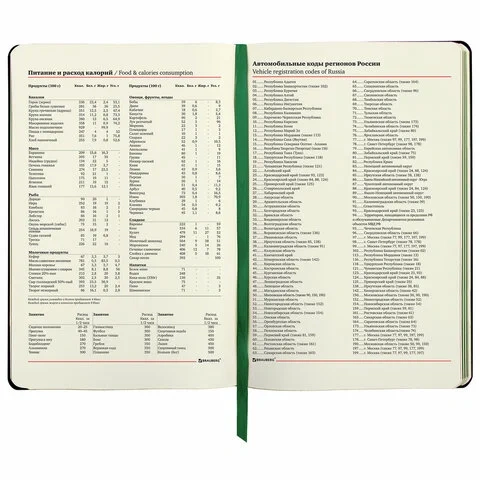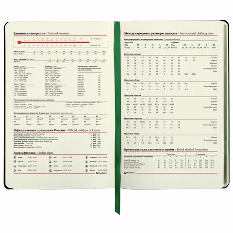 Срез ежедневника прокрашен, что придает ему особый шарм. Дополнением является закладка-ляссе, с помощью которой можно быстро открыть ежедневник на нужной странице. Помимо прочего ежедневник снабжен справочным материалом. В конце ежедневника есть 3 страницы для записей и заметок.