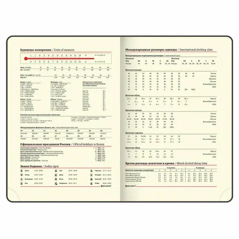 Срез ежедневника прокрашен, что придает ему особый шарм. Дополнением является закладка-ляссе, с помощью которой можно быстро открыть ежедневник на нужной странице. Помимо прочего ежедневник снабжен справочным материалом. В конце ежедневника есть 3 страницы для записей и заметок.