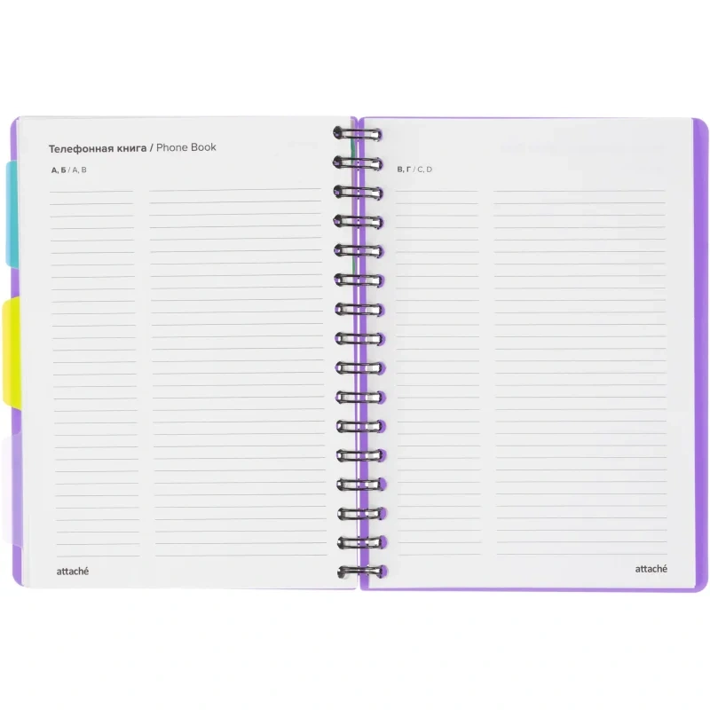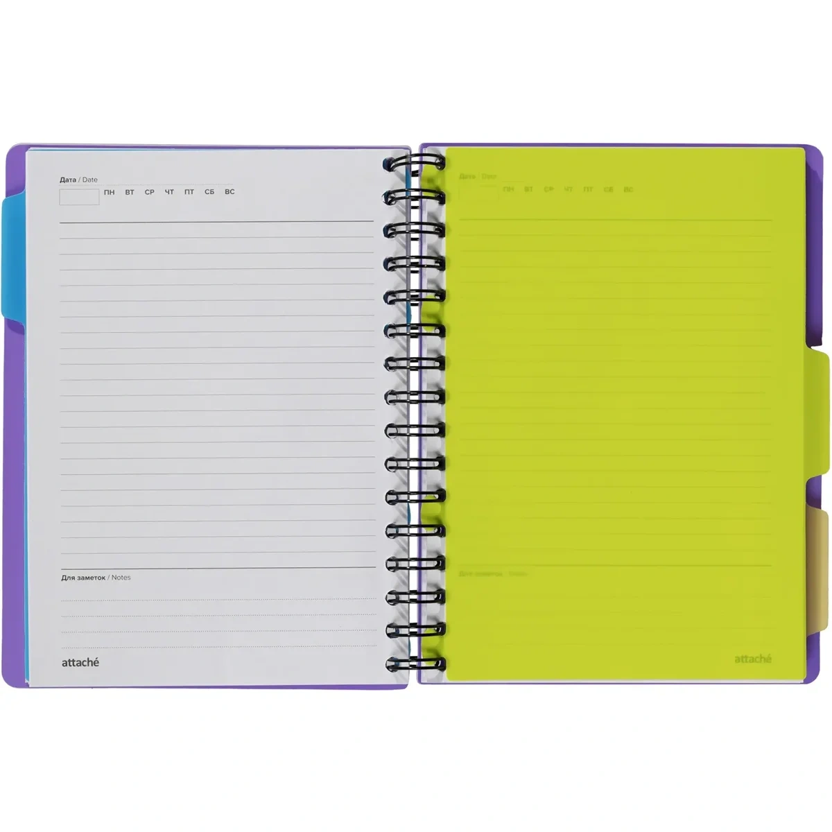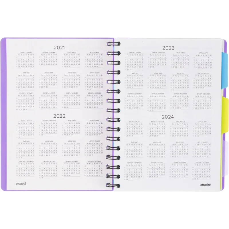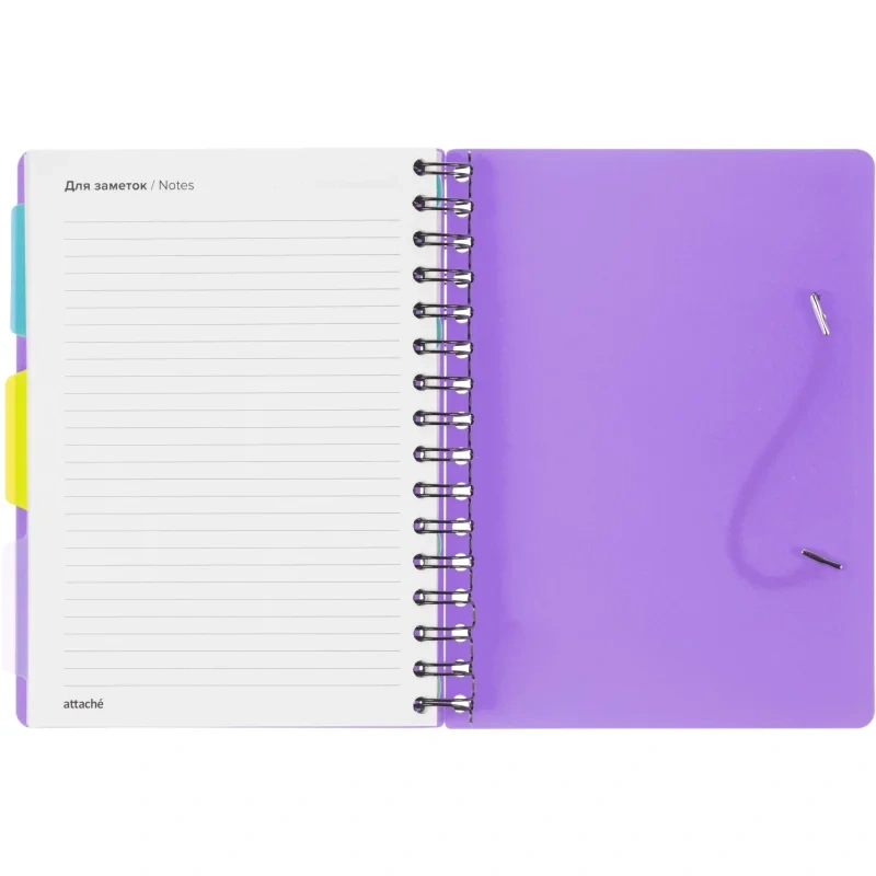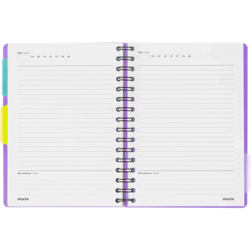 Листы крепятся на металлическую спираль увеличенного диаметра, что облегчает перелистывание страниц. Ежедневник закрывается на резинку и оснащён тремя съёмными пластиковыми разделителями для удобной организации записей.