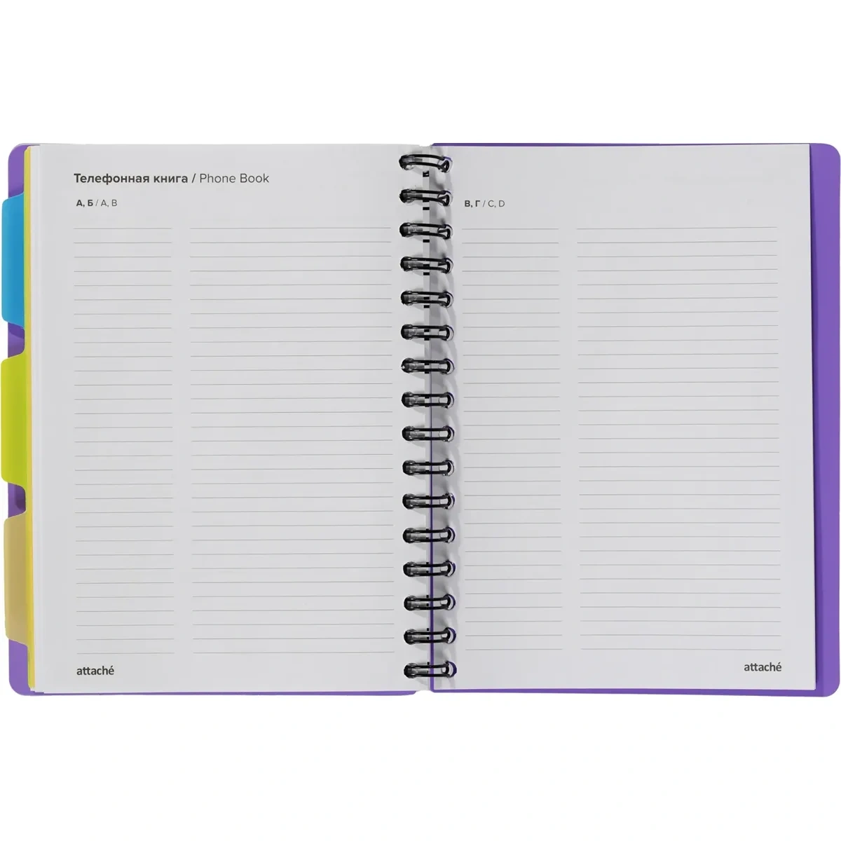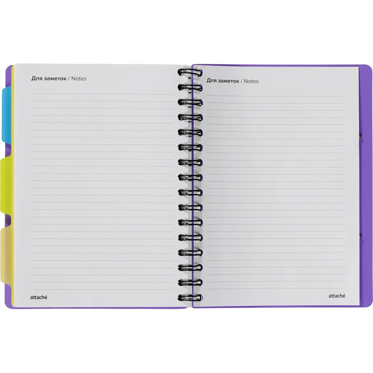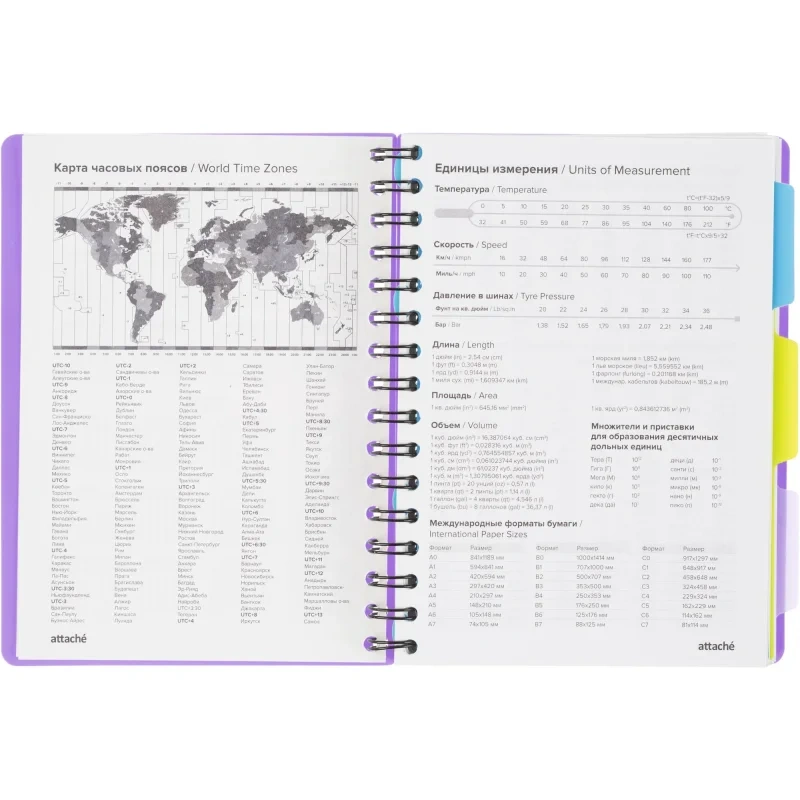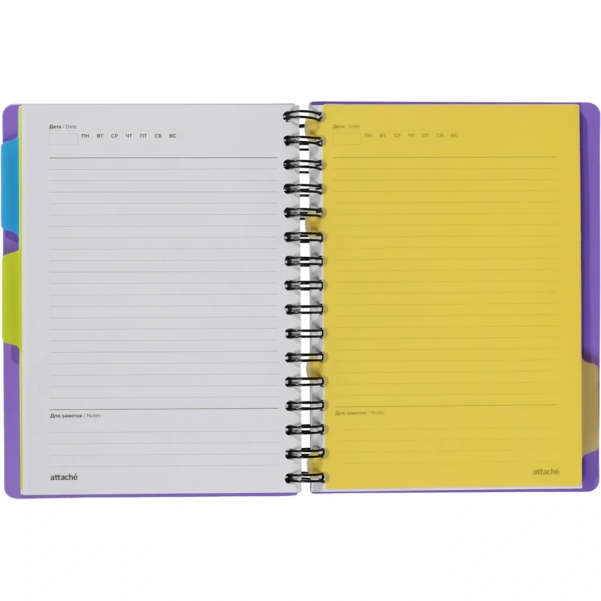 Листы крепятся на металлическую спираль увеличенного диаметра, что облегчает перелистывание страниц. Ежедневник закрывается на резинку и оснащён тремя съёмными пластиковыми разделителями для удобной организации записей.