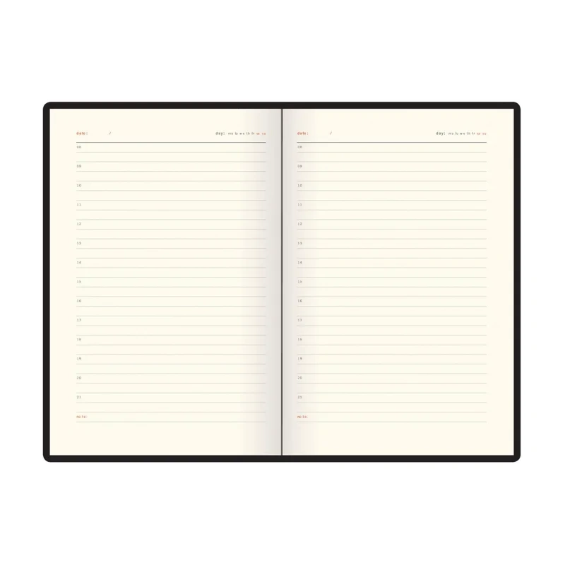 Внутренний блок состоит из 136 листов (272 страницы) тонированной офсетной бумаги плотностью 90 г/кв.м. с линейкой. Печать выполнена в два цвета, придавая ежедневнику изысканный и профессиональный вид. Включает 21 страницу справочной информации.