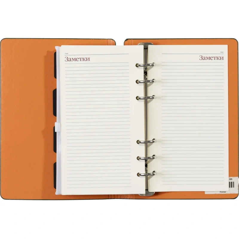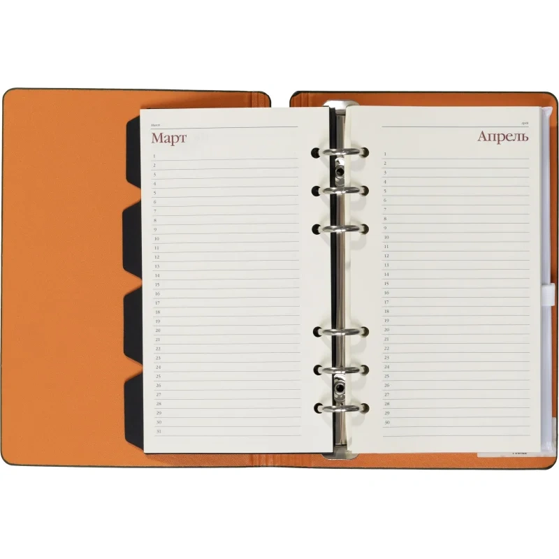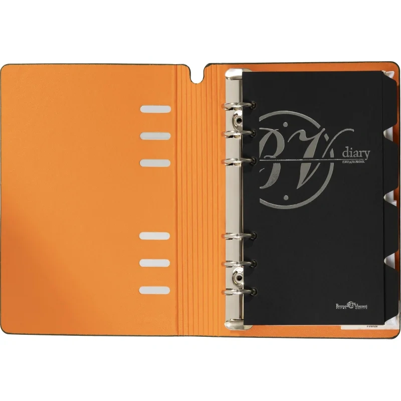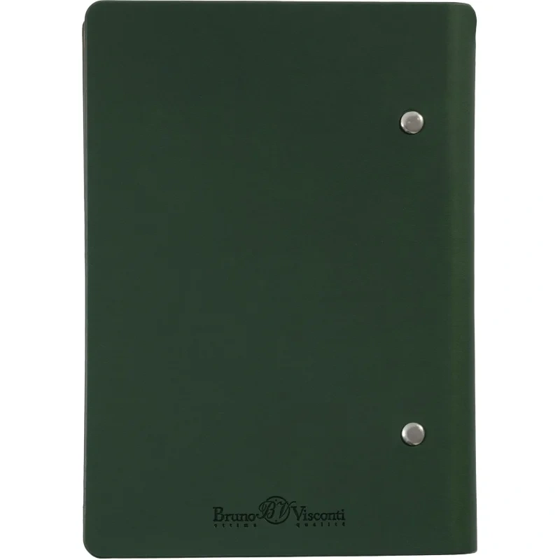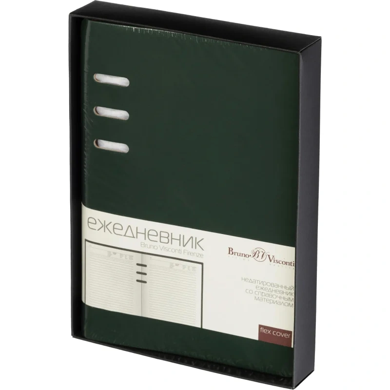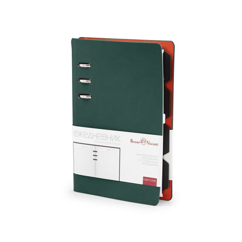 Ежедневник недатированный Bruno Visconti Firenze искусственная кожа Soft Touch 143x197 мм 120 листов зелёныйЕжедневник из коллекции Firenze от Bruno Visconti - это стильный и функциональный аксессуар, который отражает современный подход к дизайну и практичности. Обложка зелёного цвета выполнена из гладкого материала с эффектом soft-touch, который приятно ощущается на ощупь и минимально изнашивается со временем. Скруглённые уголки и углубление для фиксации клипа для письменных принадлежностей делают его удобным и элегантным. Для оформления форзацев использована гладкая искусственная кожа оранжевого цвета.Внутренний блок состоит из 120 листов (240 страниц) высококачественной бежевой офсетной бумаги плотностью 70 г/кв.м., с линовкой в линейку для удобной записи. Страницы недатированные, что даёт возможность начать использовать ежедневник в любой момент. Металлический разжимной механизм надёжно удерживает все страницы.Ежедневник дополнен функциональными элементами: пластиковым конвертом для бумаг и визиток, а также картонными разделителями для структурирования записей по разделам.Ежедневник поставляется в индивидуальной картонной коробке (размер 143x197 мм). Возможность персонализации добавляет индивидуальности и делает его идеальным для корпоративных нужд.