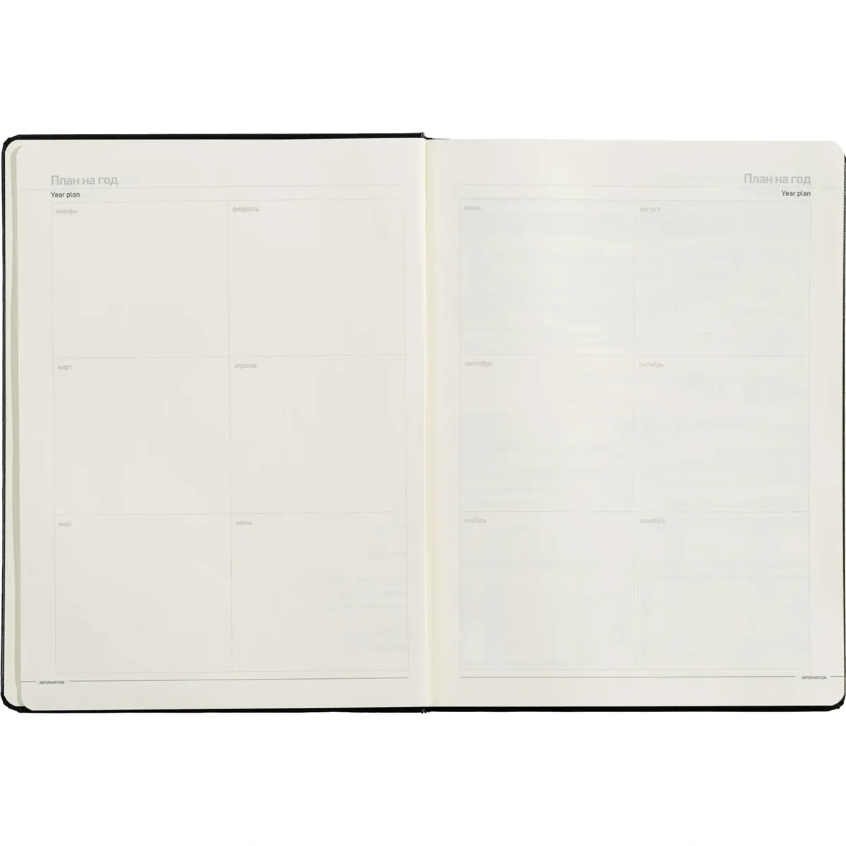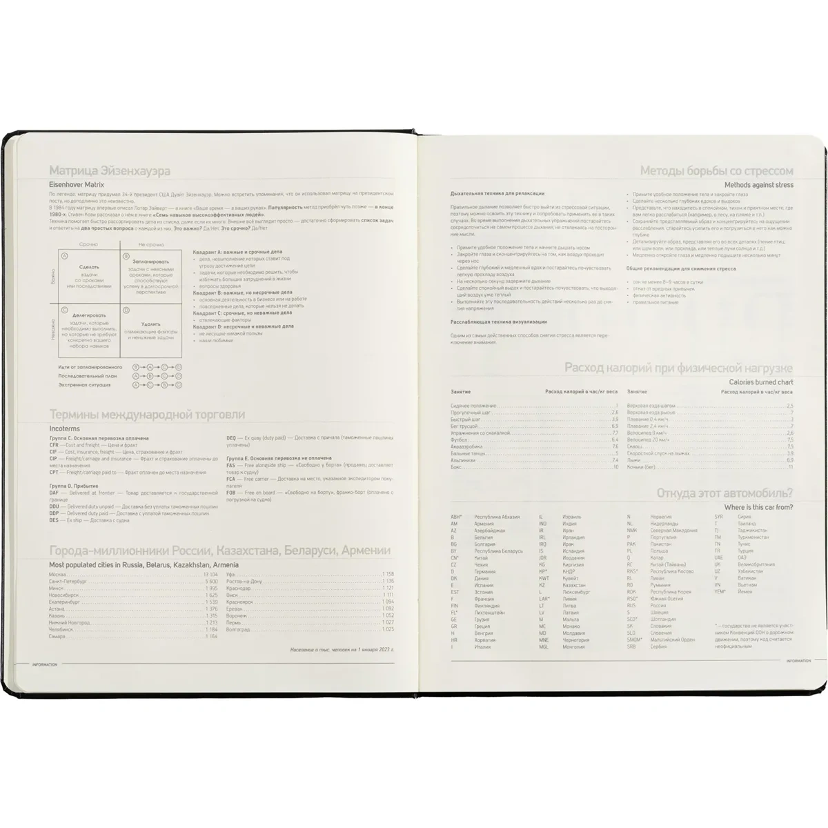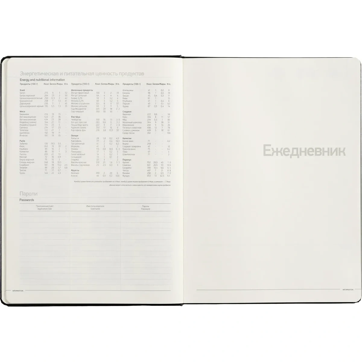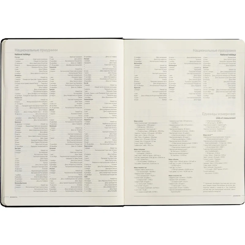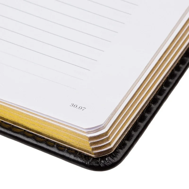 Внутренний блок состоит из 160 страниц бежевой офсетной бумаги плотностью 90 г/кв.м., с линовкой в линейку и печатью в одном цвете. Блок включает 320 страниц для записей, а также справочный информационный раздел. Цветной обрез золотистого цвета завершает дизайн. Ежедневник также подходит для персонализации с нанесением логотипа.