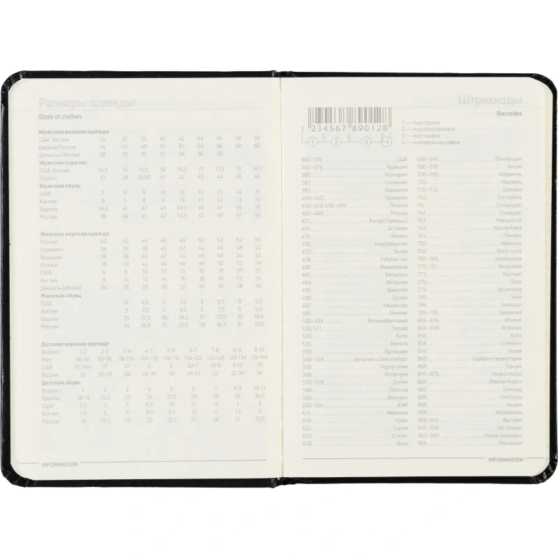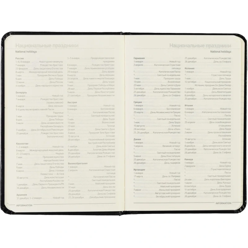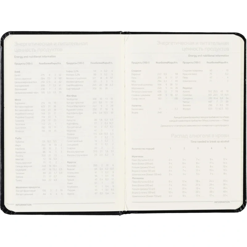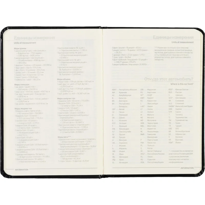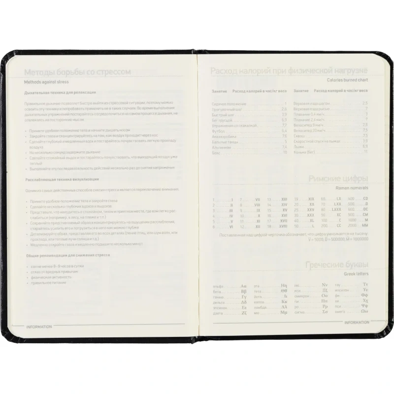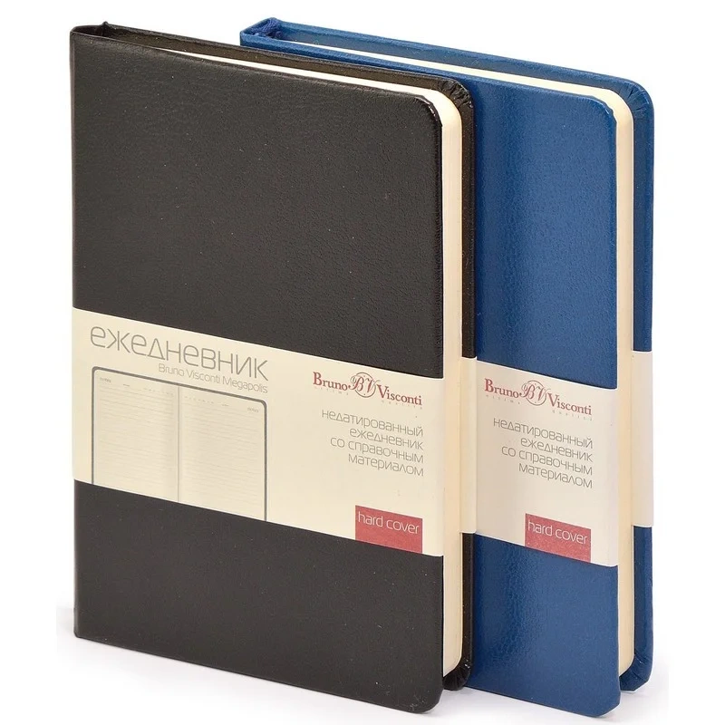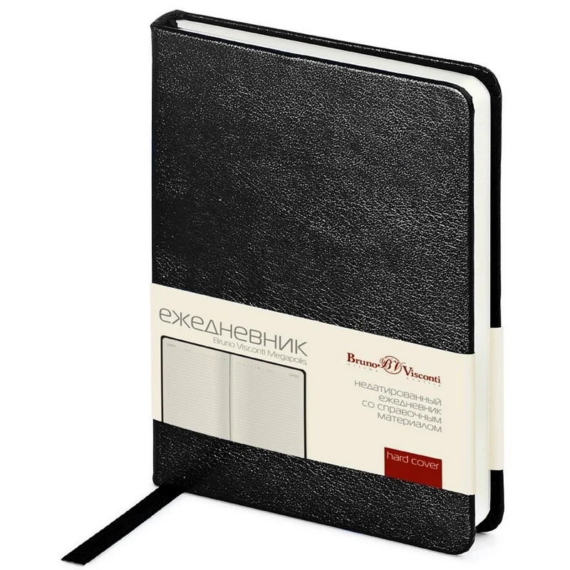 Ежедневник недатированный Bruno Visconti, цвет черный. Коллекция Megapolis. Формата А6, размер изделия — 88x131 мм. Строгая черная обложка с закругленными уголками сделана из традиционного переплетного материала, обладающего повышенной практичностью и долговечностью. Тип возможного тиснения — фольгирование и шелкотрафаретная печать. На поверхность возможно горячее тиснение, но само тиснение будет ’слепым’, подходит тиснение фольгой, особенно белой. Этот аксессуар с твёрдой обложкой, плотной и приятной на ощупь бумагой подходит для серьёзного человека.Блок: недатированный, офсетная бумага бежевого цвета, плотностью 70 г/кв.м., 100 листов (200 страниц), размер блока — 87x130 мм, удобная закладка-ленточка (ляссе) поможет быстро найти нужную страницу, печать блока в 2 краски.Ежедневник имеет обширный справочный материал из 16 листов (32 страницы) — личные данные, цифровые автомобильные коды,энергетическая и питательная ценность продуктов, расход калорий при физической нагрузке,формат бумаги, размер одежды, греческие буквы, национальные праздники, скорость, страны мира, религиозные праздники, распад алкоголя в крови, десятичные приставки, римские цифры, дни рождения и годовщины. Восемь последних листов снабжены микроперфорацией, гарантирующей аккуратную линию отрыва. Упакован в термоусадочную пленку.