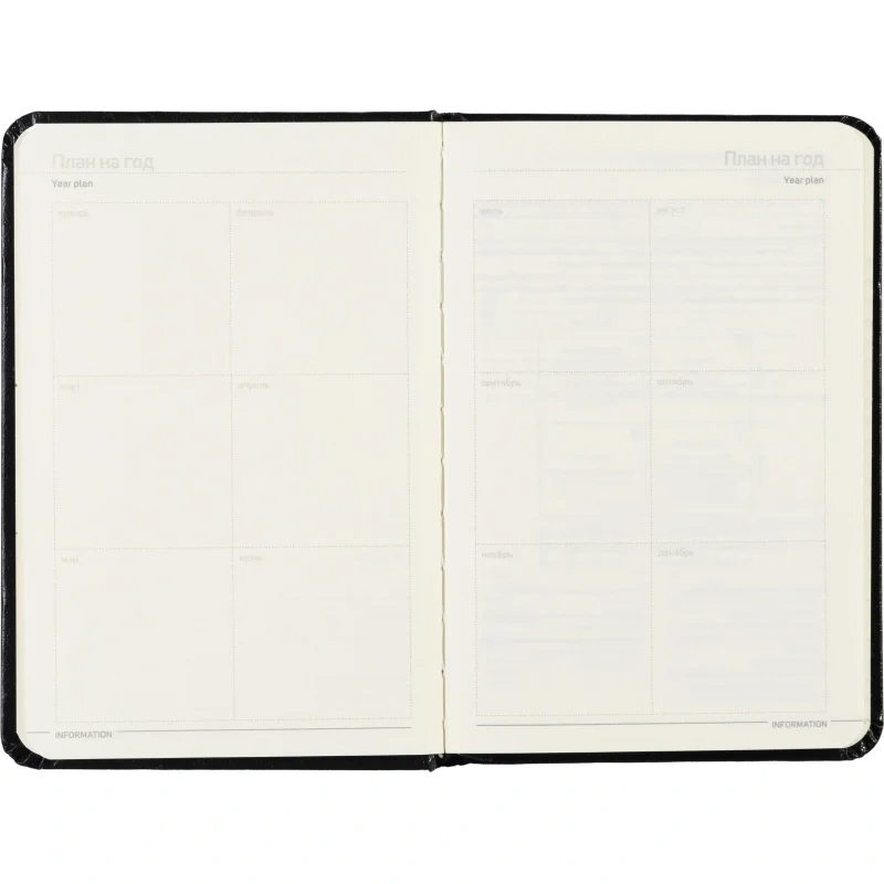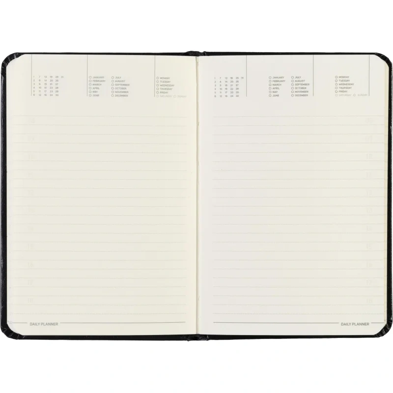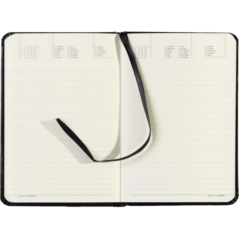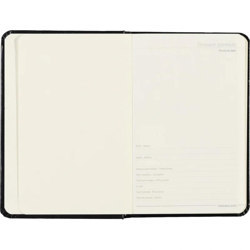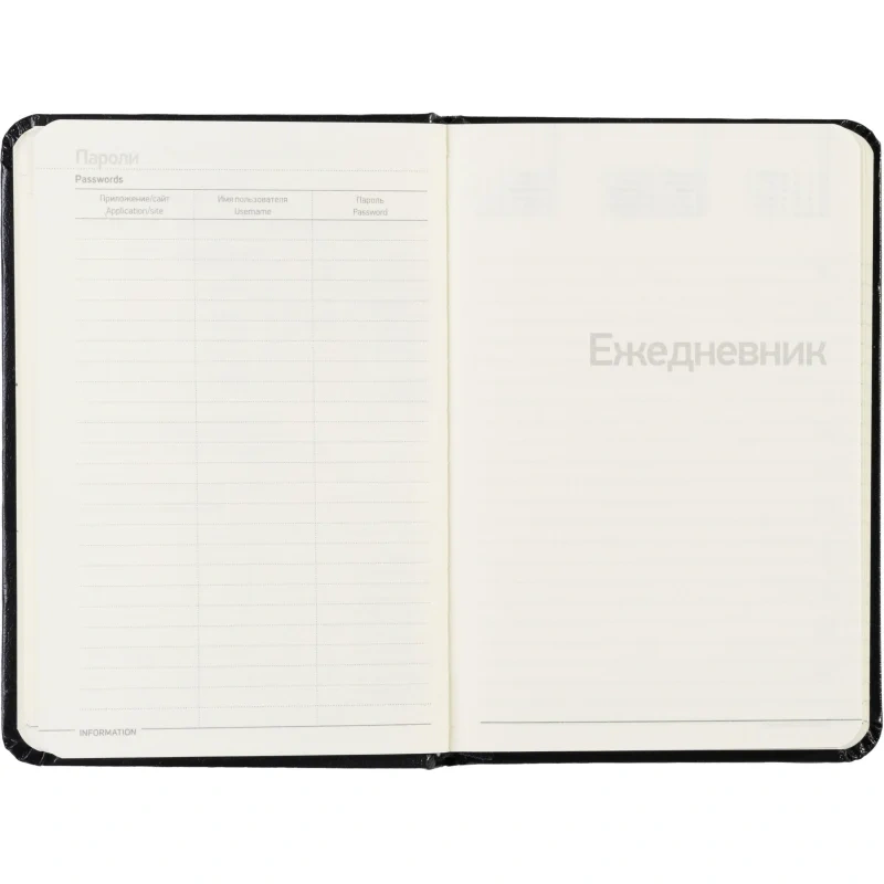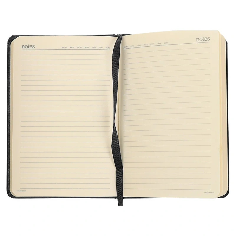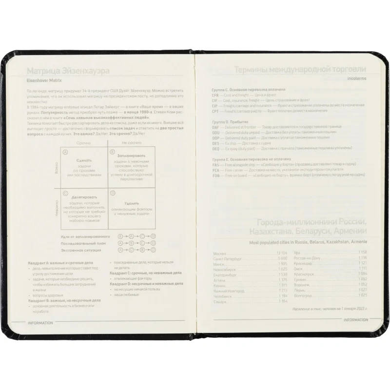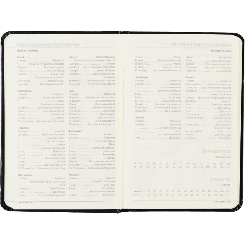 Ежедневник недатированный Bruno Visconti, цвет черный. Коллекция Megapolis. Формата А6, размер изделия — 88x131 мм. Строгая черная обложка с закругленными уголками сделана из традиционного переплетного материала, обладающего повышенной практичностью и долговечностью. Тип возможного тиснения — фольгирование и шелкотрафаретная печать. На поверхность возможно горячее тиснение, но само тиснение будет ’слепым’, подходит тиснение фольгой, особенно белой. Этот аксессуар с твёрдой обложкой, плотной и приятной на ощупь бумагой подходит для серьёзного человека.Блок: недатированный, офсетная бумага бежевого цвета, плотностью 70 г/кв.м., 100 листов (200 страниц), размер блока — 87x130 мм, удобная закладка-ленточка (ляссе) поможет быстро найти нужную страницу, печать блока в 2 краски.Ежедневник имеет обширный справочный материал из 16 листов (32 страницы) — личные данные, цифровые автомобильные коды,энергетическая и питательная ценность продуктов, расход калорий при физической нагрузке,формат бумаги, размер одежды, греческие буквы, национальные праздники, скорость, страны мира, религиозные праздники, распад алкоголя в крови, десятичные приставки, римские цифры, дни рождения и годовщины. Восемь последних листов снабжены микроперфорацией, гарантирующей аккуратную линию отрыва. Упакован в термоусадочную пленку.