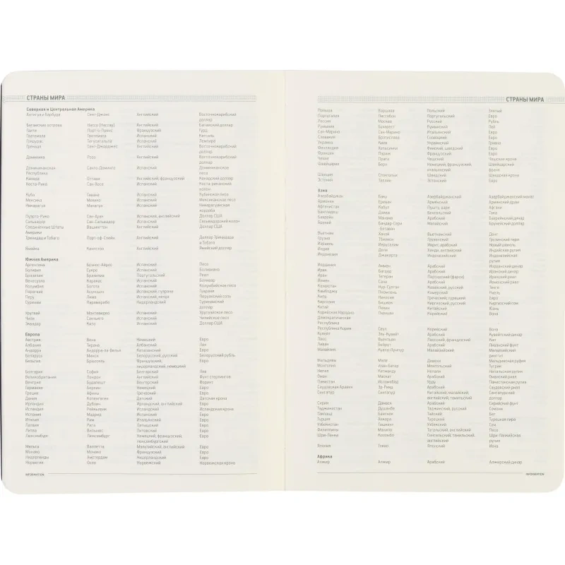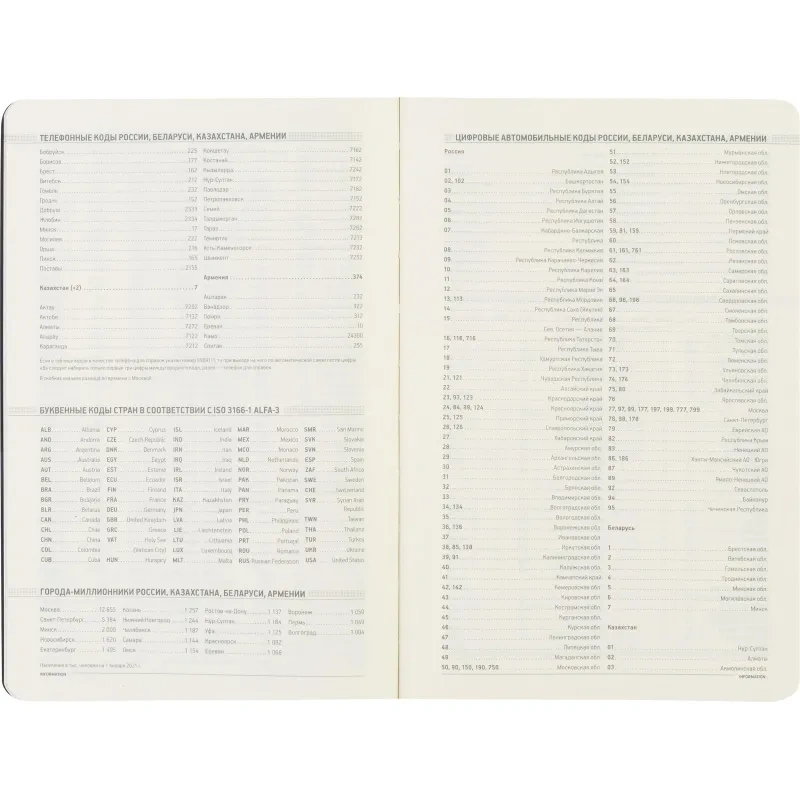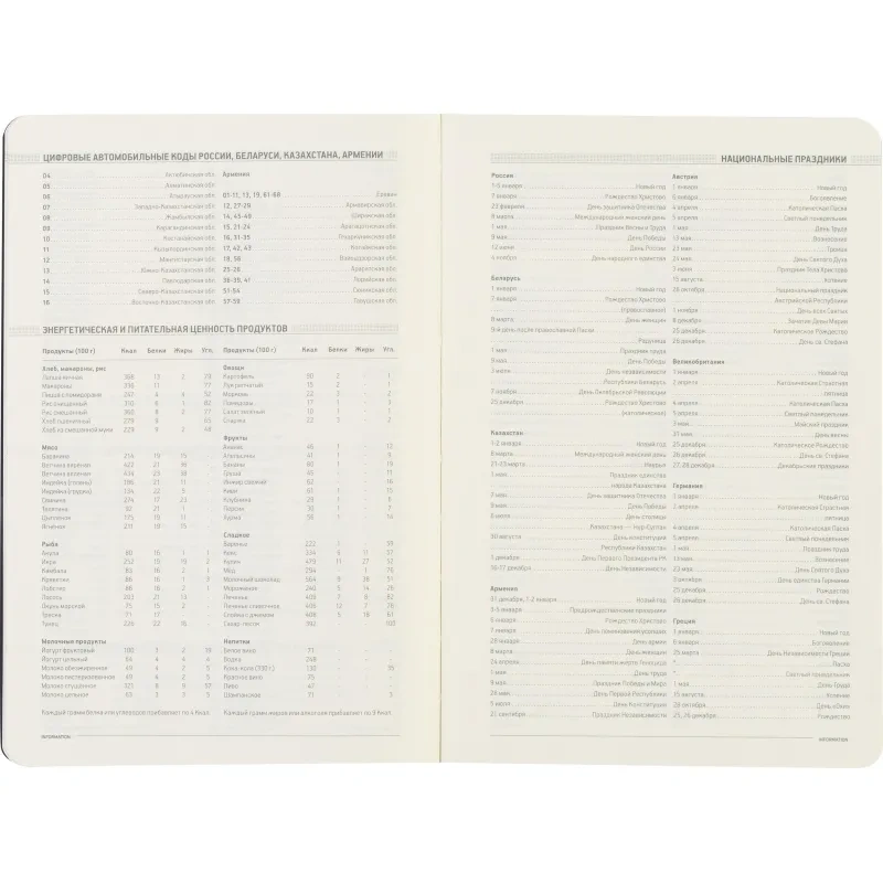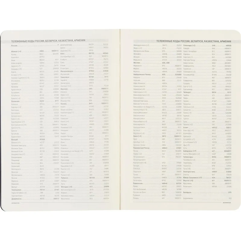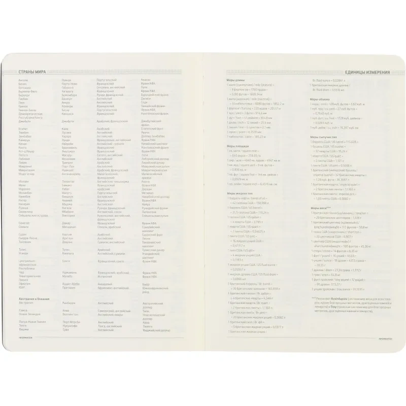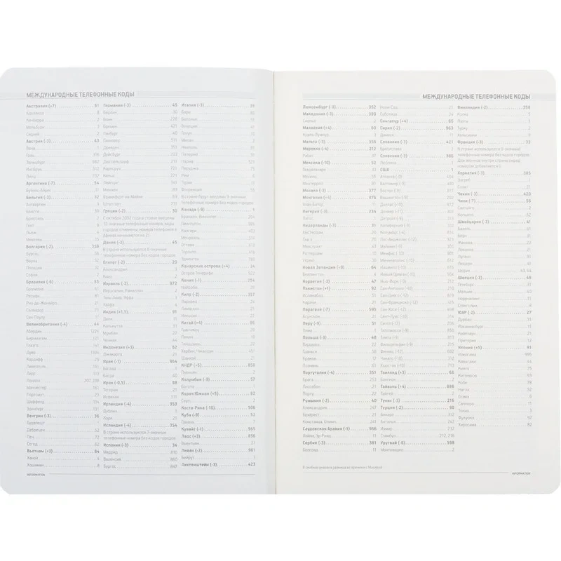 Внутренний блок содержит 136 страниц, выполненных из бежевого офсетного материала повышенной плотности (90 г/кв.м.), что снижает усталость глаз при длительной работе. Блок не привязан к конкретным датам, и даты указываются в выделенном поле вверху страницы. На страницах также предусмотрены справочные материалы и телефонная книга.