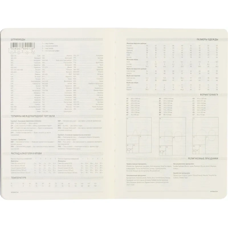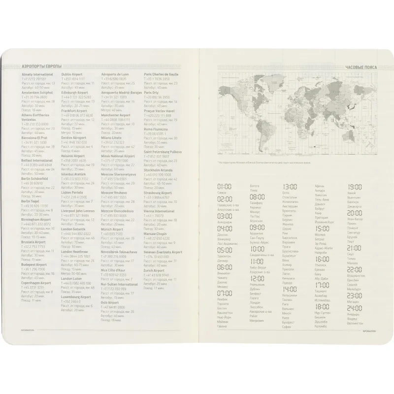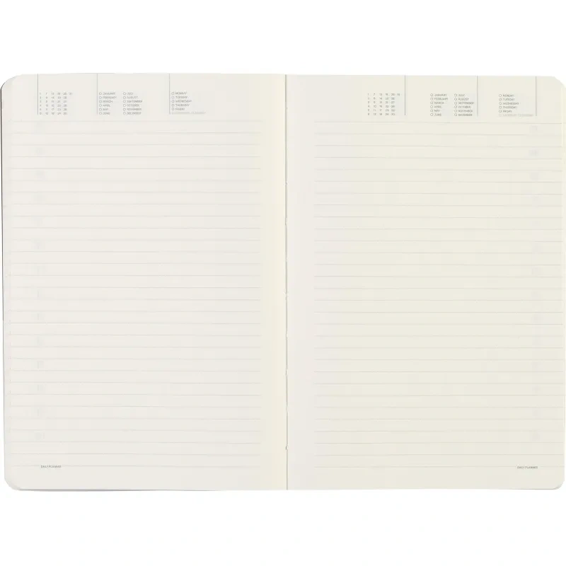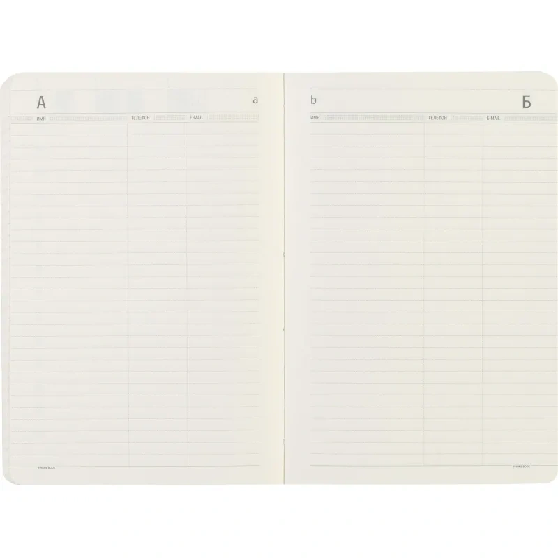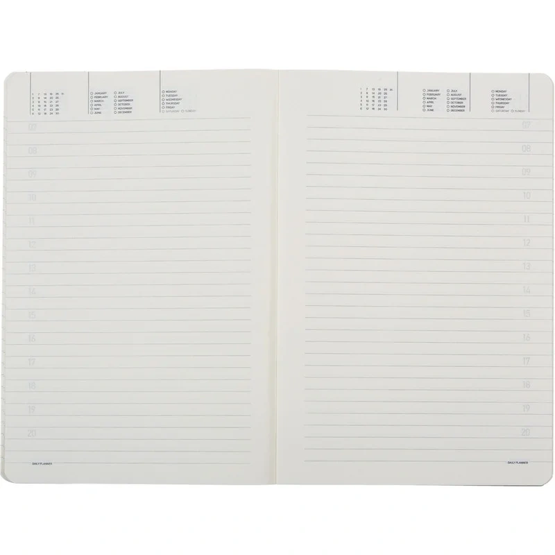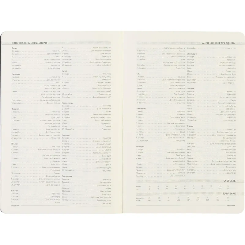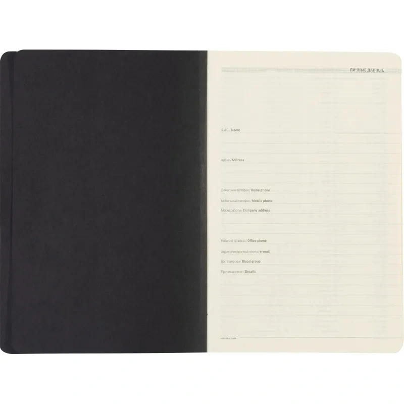 Внутренний блок содержит 136 страниц, выполненных из бежевого офсетного материала повышенной плотности (90 г/кв.м.), что снижает усталость глаз при длительной работе. Блок не привязан к конкретным датам, и даты указываются в выделенном поле вверху страницы. На страницах также предусмотрены справочные материалы и телефонная книга.