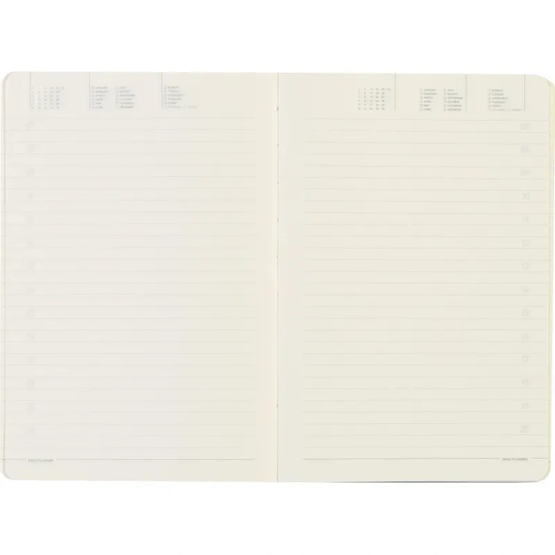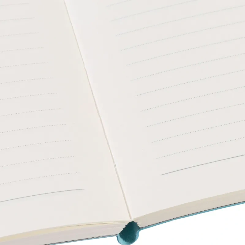 Внутренний блок на 136 страниц состоит из бежевого офсетного материала с плотностью 90 г/кв.м.. Блок не привязан к датам, и они могут быть указаны в выделенном поле вверху страницы. Тонированная бумага снижает утомляемость глаз при письме.