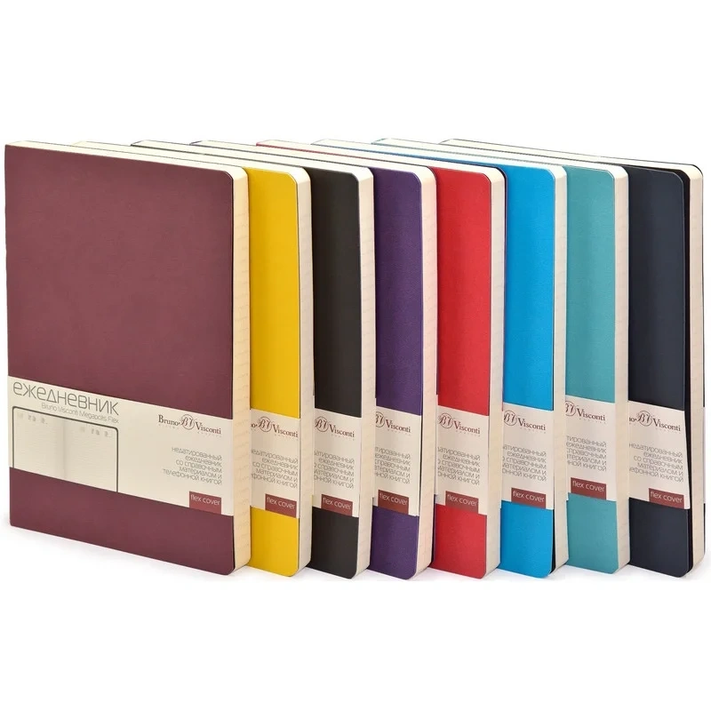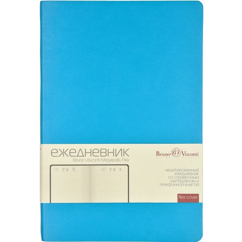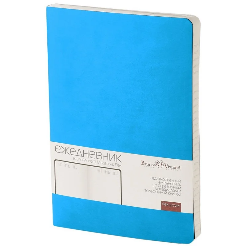 Ежедневник Bruno Visconti Megapolis Flex формата А5 (14×21 см) с мягкой обложкой голубого цвета выполнен из искусственной кожи с отделкой Soft Touch. Углы скруглённые.