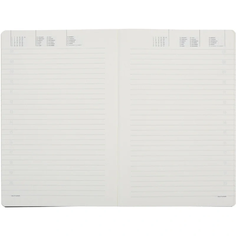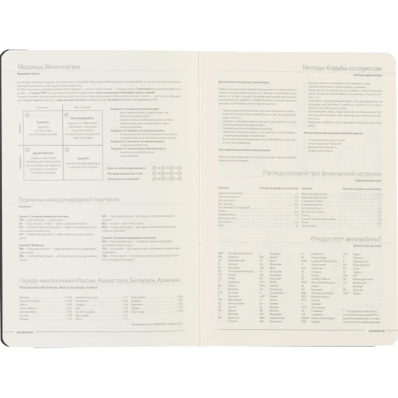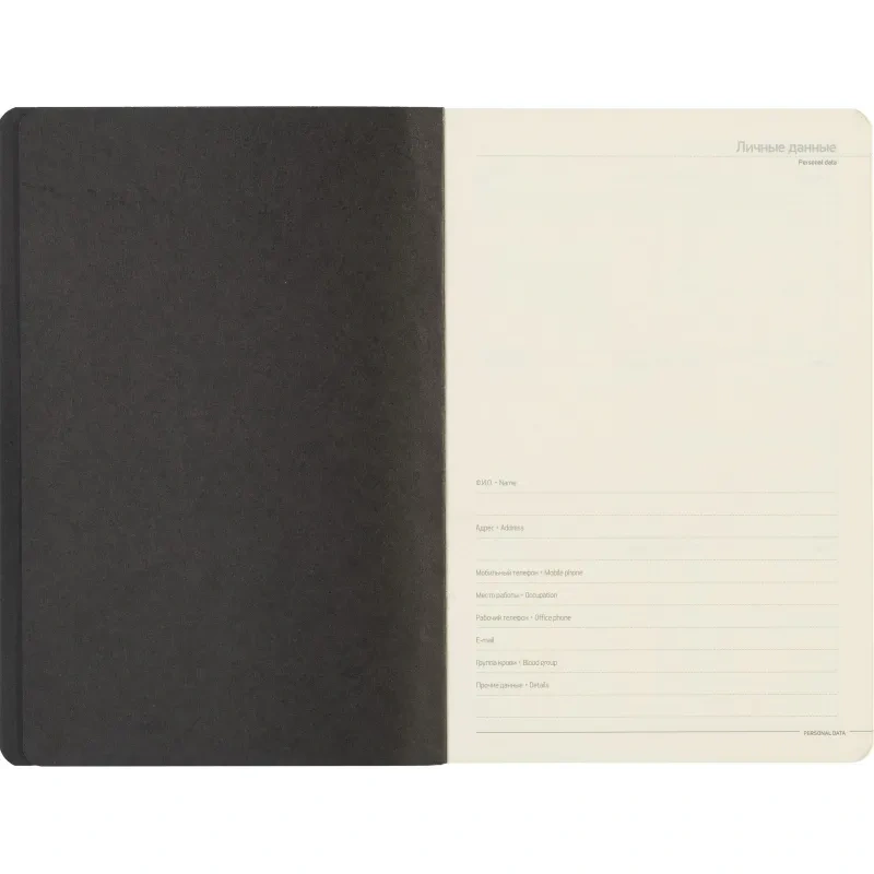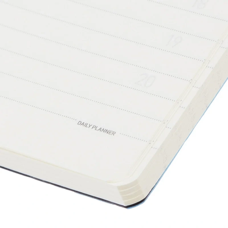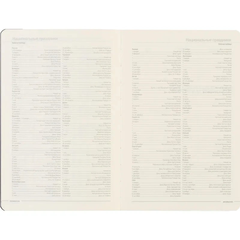 Внутренний блок состоит из 136 страниц, выполненных из бежевого офсетного материала плотностью 90 г/кв.м., с линовкой в линейку и печатью в одном цвете. Блок не привязан к конкретным датам, и даты можно указывать в выделенном поле вверху страницы. Тонированная бумага снижает утомляемость глаз при длительном использовании. Внутри есть справочный раздел и телефонная книга. Возможность персонализации с нанесением логотипа на обложку делает этот ежедневник отличным выбором для корпоративных нужд.