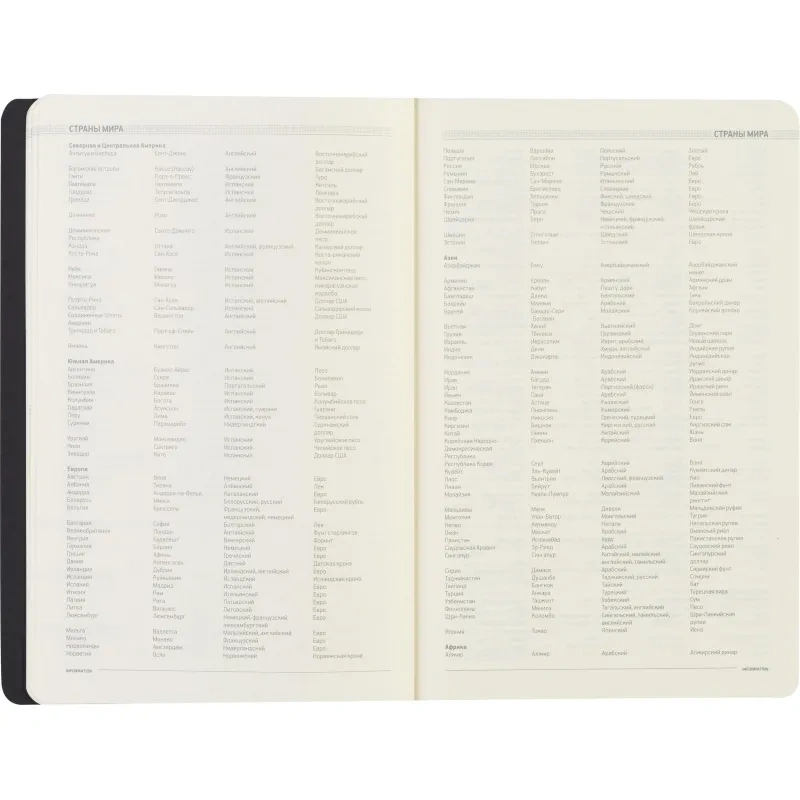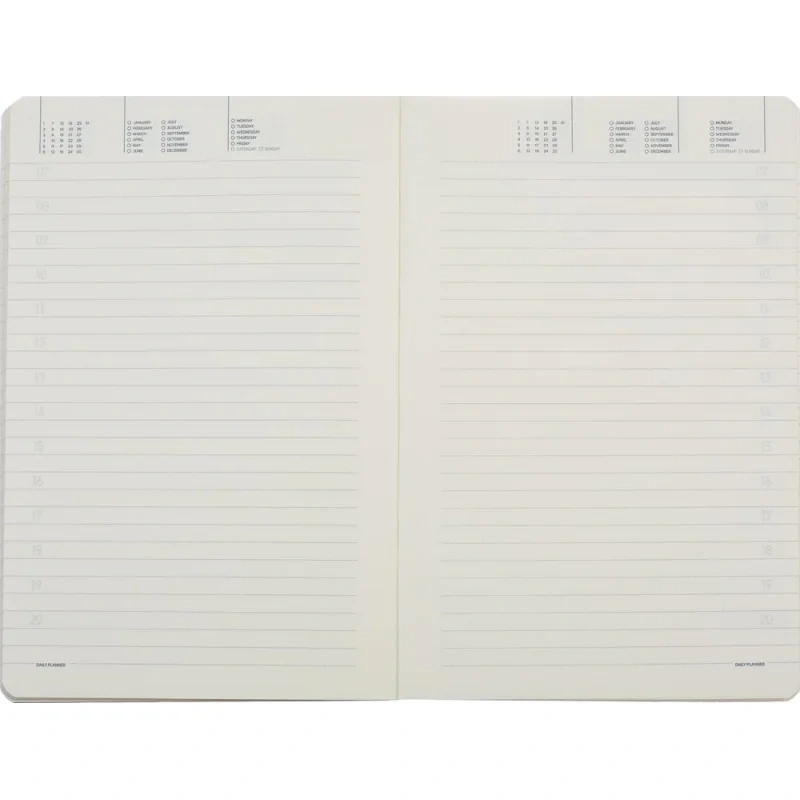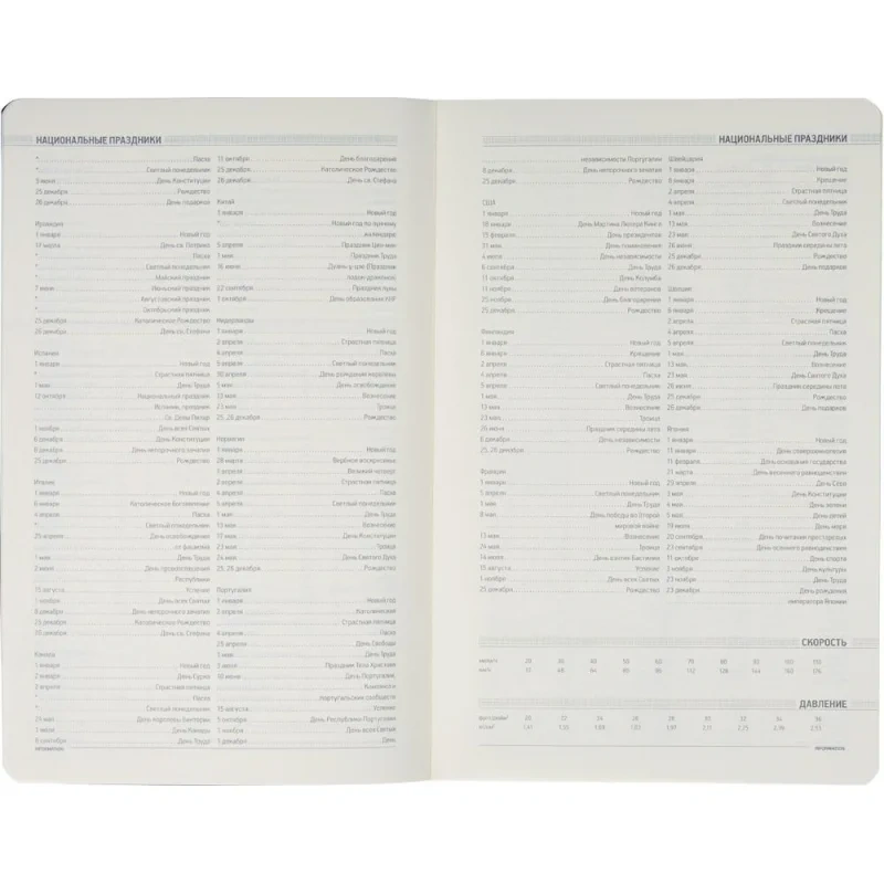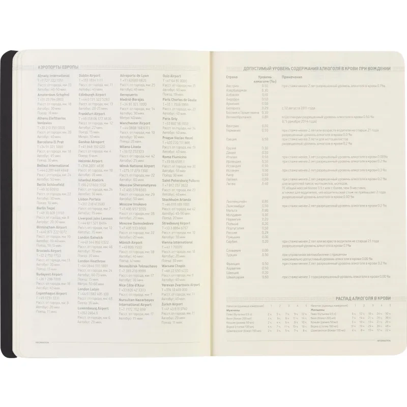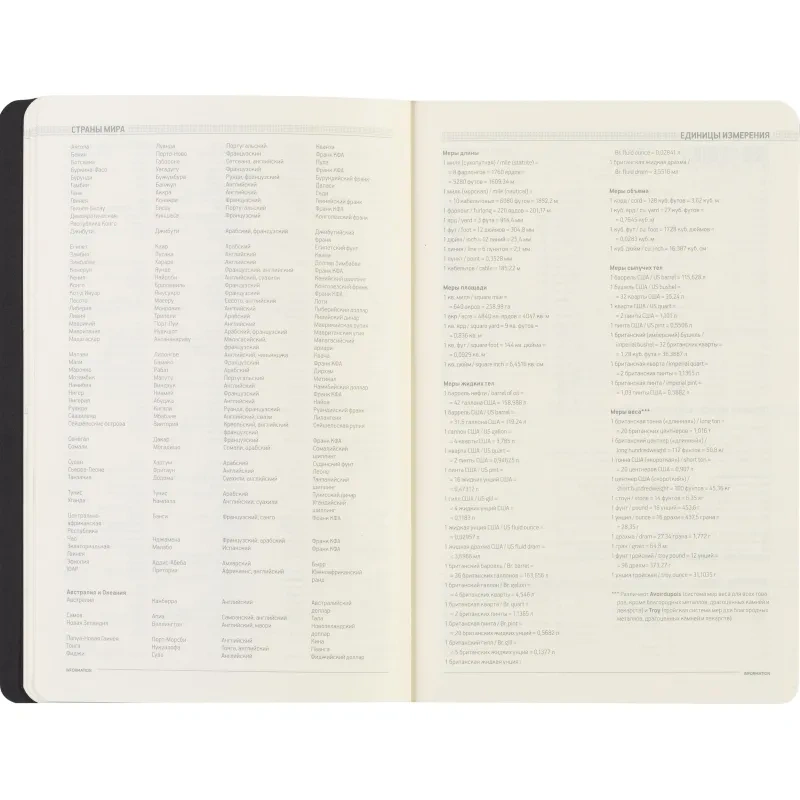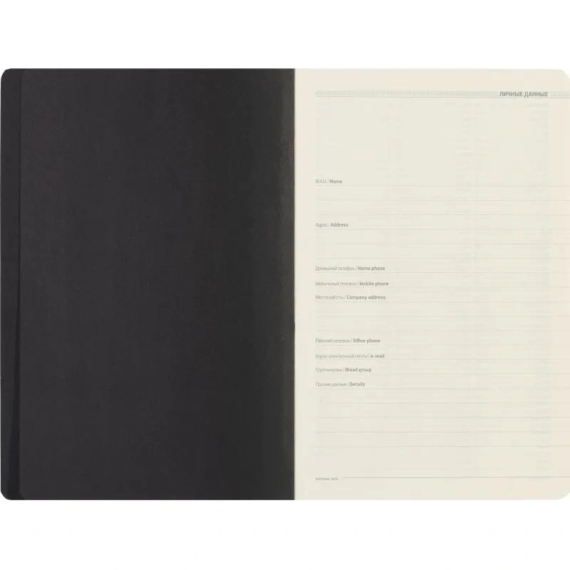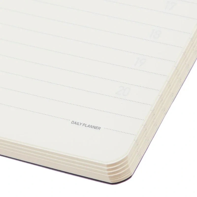 Внутренний блок состоит из 136 страниц бежевого офсетного материала с плотностью 90 г/кв.м.. Блок не привязан к конкретным датам, и они могут быть указаны в выделенном поле вверху страницы. Тонированная бумага делает работу с ежедневником комфортной. Внутри есть справочный раздел и телефонная книга.