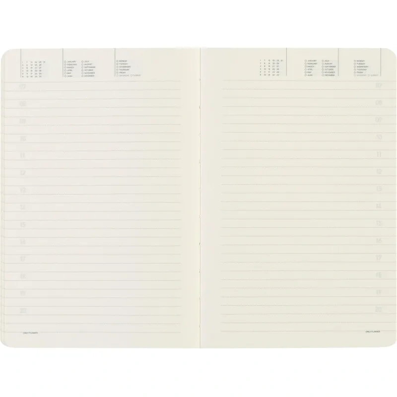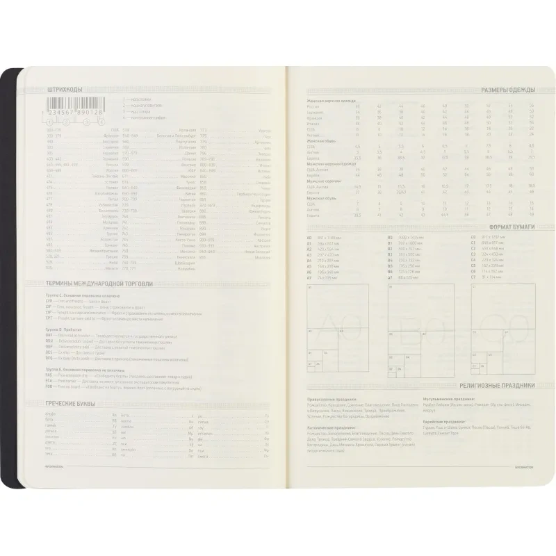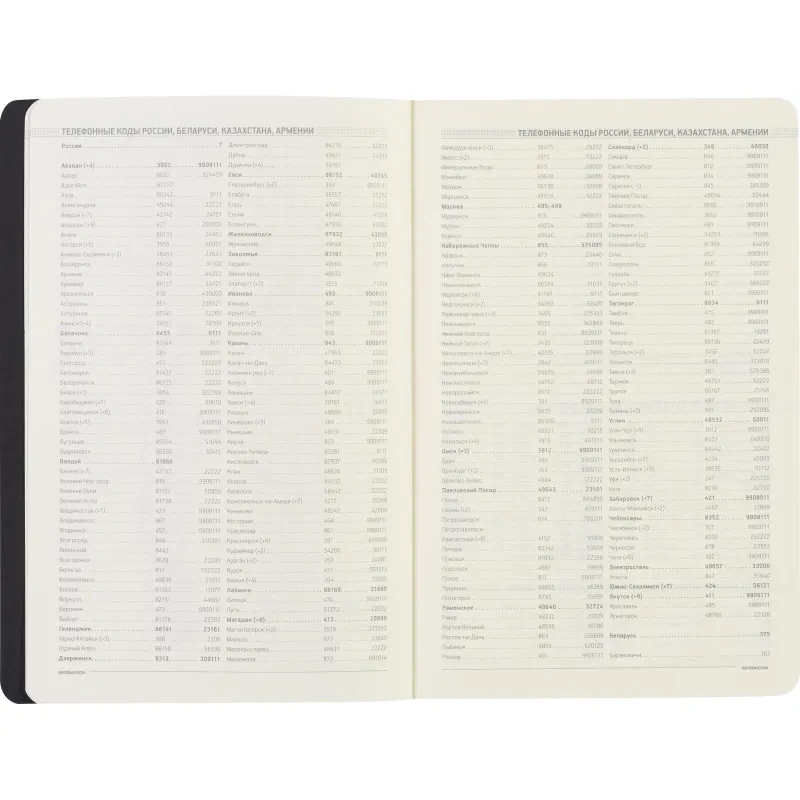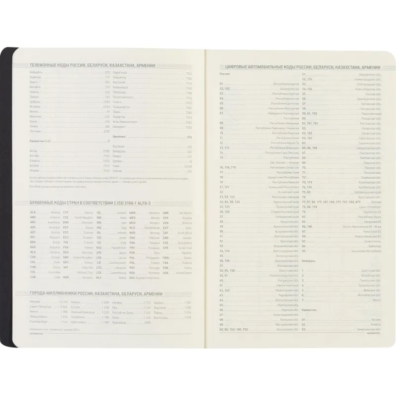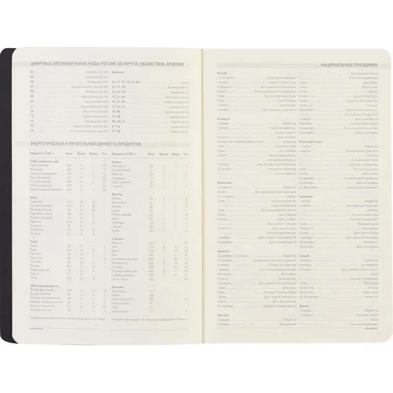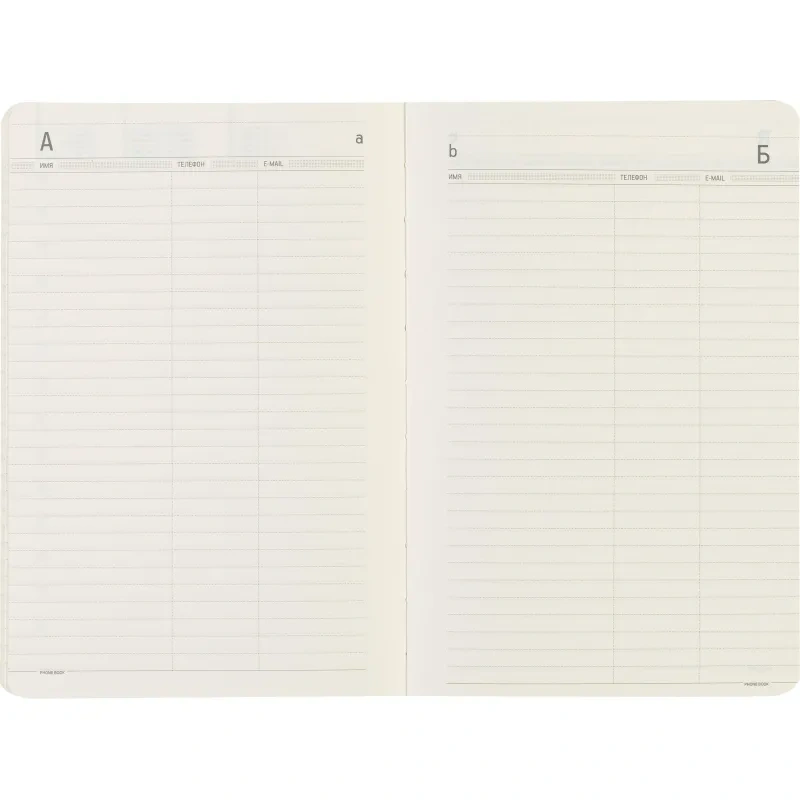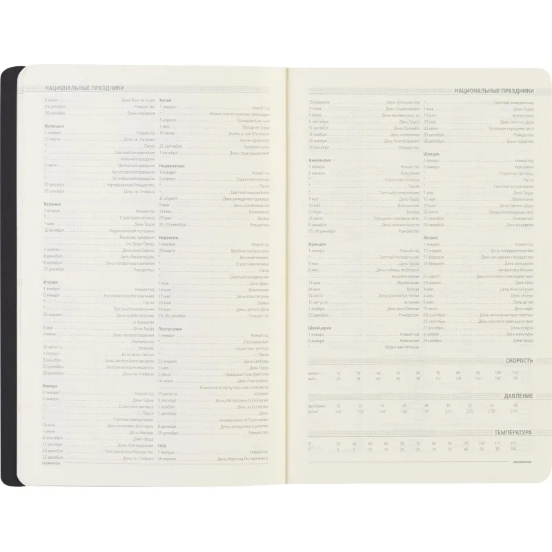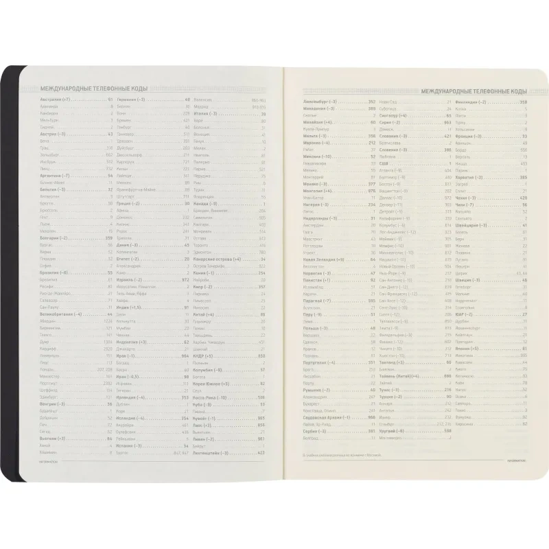 Внутренний блок состоит из 136 страниц бежевого офсетного материала с плотностью 90 г/кв.м.. Блок не привязан к конкретным датам, и они могут быть указаны в выделенном поле вверху страницы. Тонированная бумага делает работу с ежедневником комфортной. Внутри есть справочный раздел и телефонная книга.