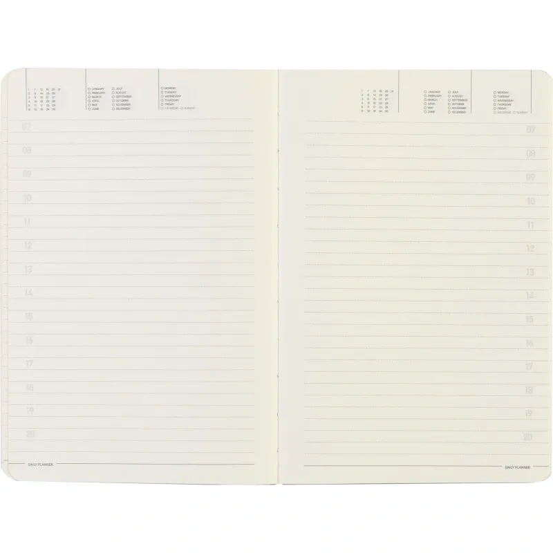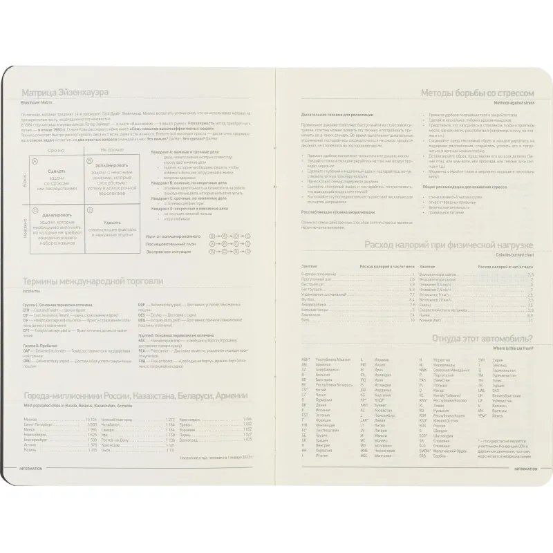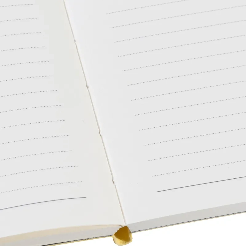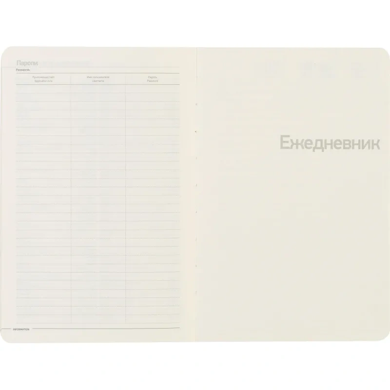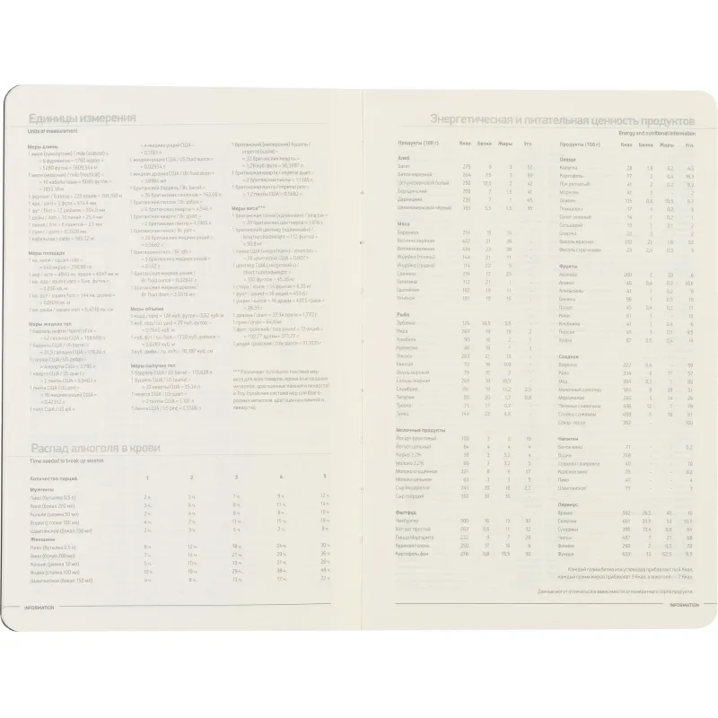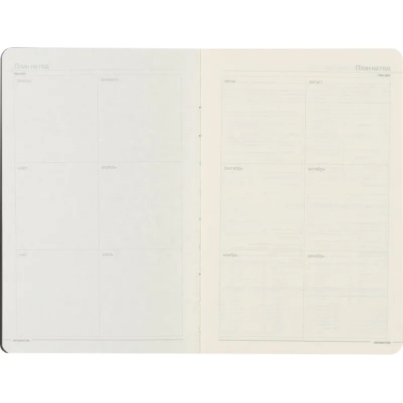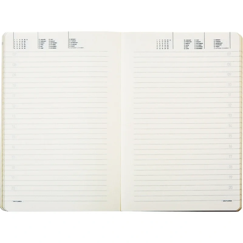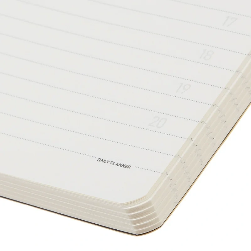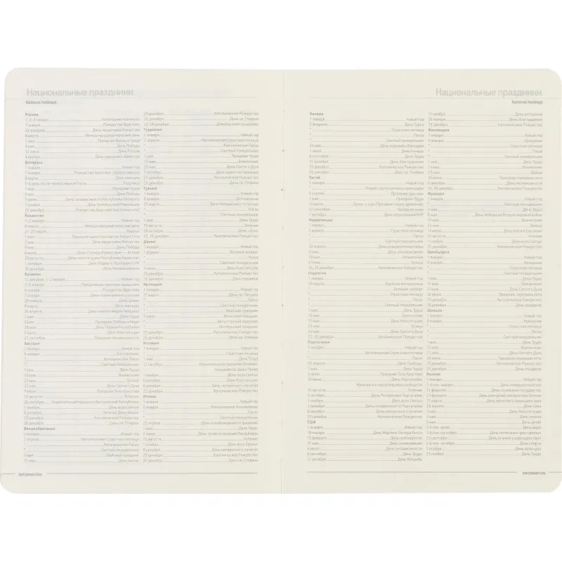 Внутренний блок на 136 страниц состоит из бежевого офсетного материала с плотностью 90 г/кв.м. Блок не привязан к датам, которые можно указывать в выделенном поле вверху страницы. Тонированная бумага снижает утомляемость глаз.
