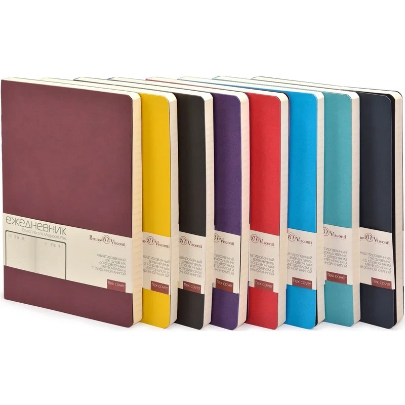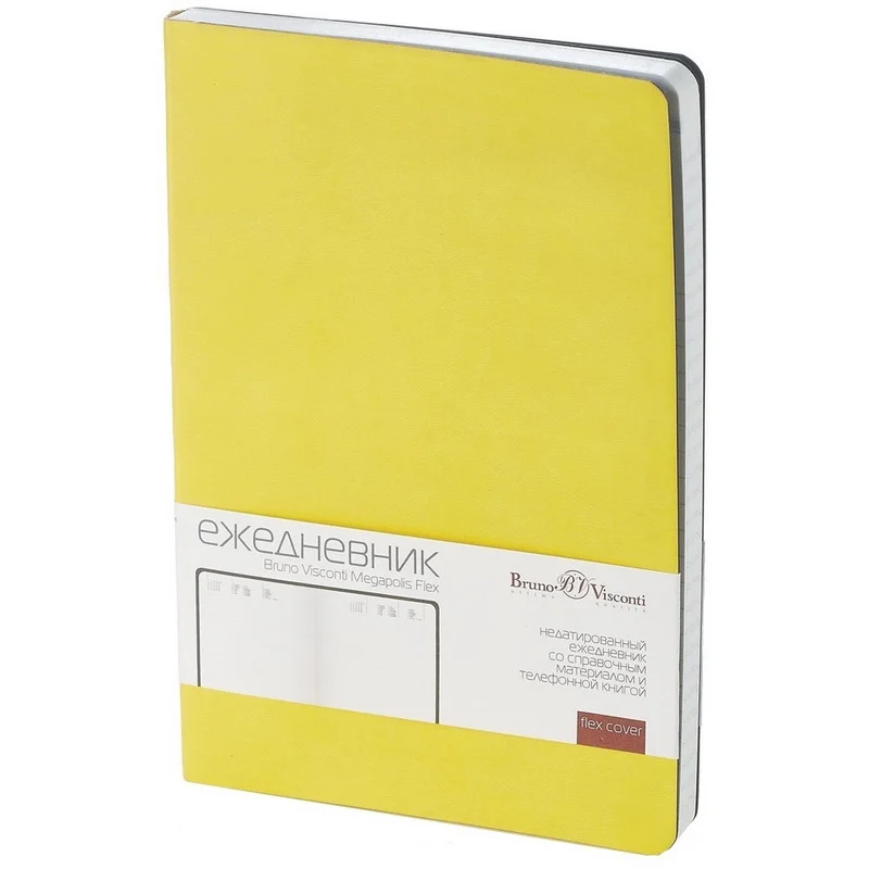 Ежедневник недатированный Bruno Visconti Megapolis Flex выполнен из искусственной кожи Soft Touch A5, содержит 136 листов жёлтого цвета. Ежедневник Bruno Visconti Megapolis Flex формата A5 (14×21 см) с мягкой обложкой ярко-жёлтого цвета выполнен из искусственной кожи с отделкой Soft Touch. Обложка имеет элегантные закруглённые углы.