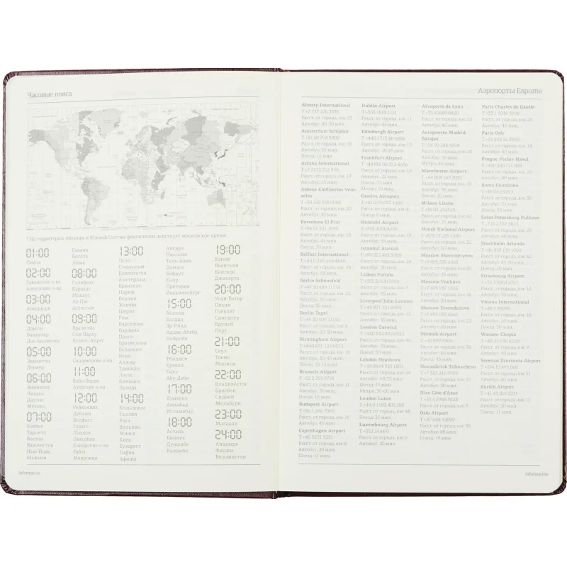 Ежедневник включает обширный справочный материал из 16 листов (32 страницы), охватывающий такие данные, как личные данные, автомобильные коды, энергетическая ценность продуктов, расход калорий при физической нагрузке, размер одежды, греческие буквы, национальные и религиозные праздники и другие. Восьмые последние листа снабжены перфорацией для удобного отрыва.
