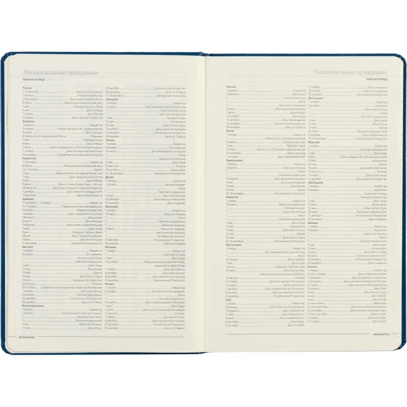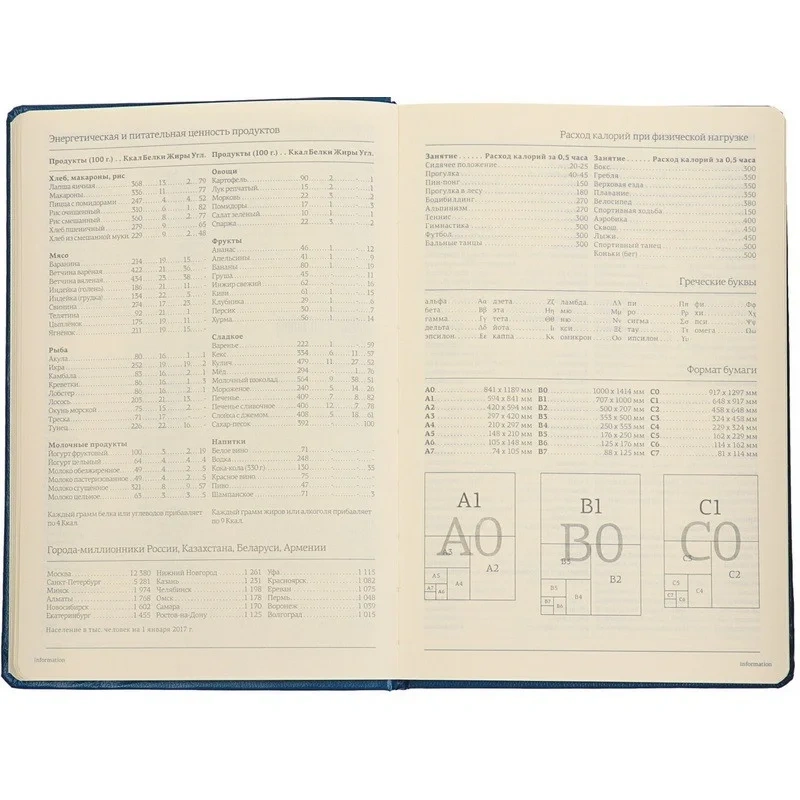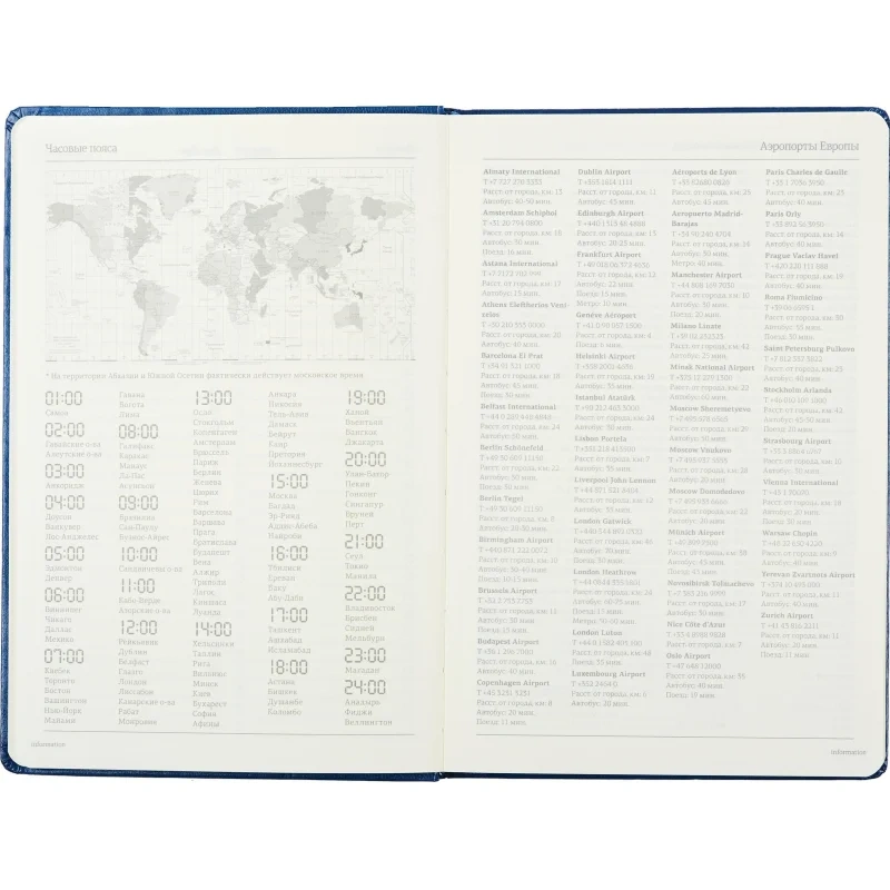 Ежедневник включает обширный справочный материал на 16 листах (32 страницы), охватывающий такие темы, как личные данные, автомобильные коды, расход калорий, размер одежды, греческие буквы, религиозные и национальные праздники, римские цифры и многие другие полезные сведения. 8 последних листов являются отрывными с перфорацией.