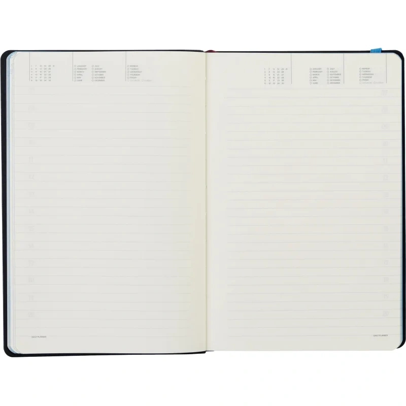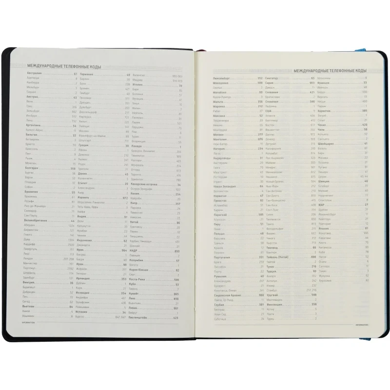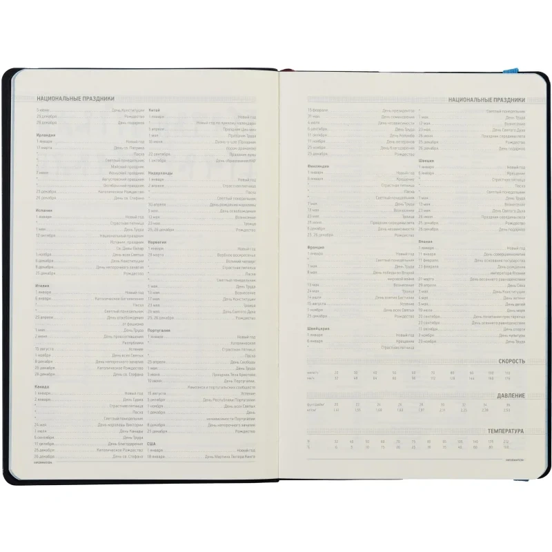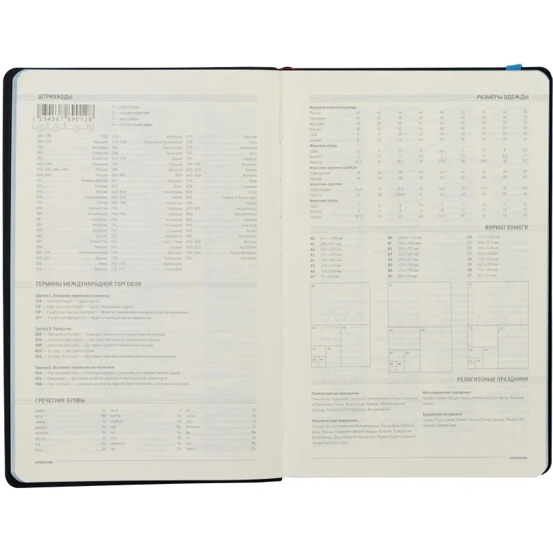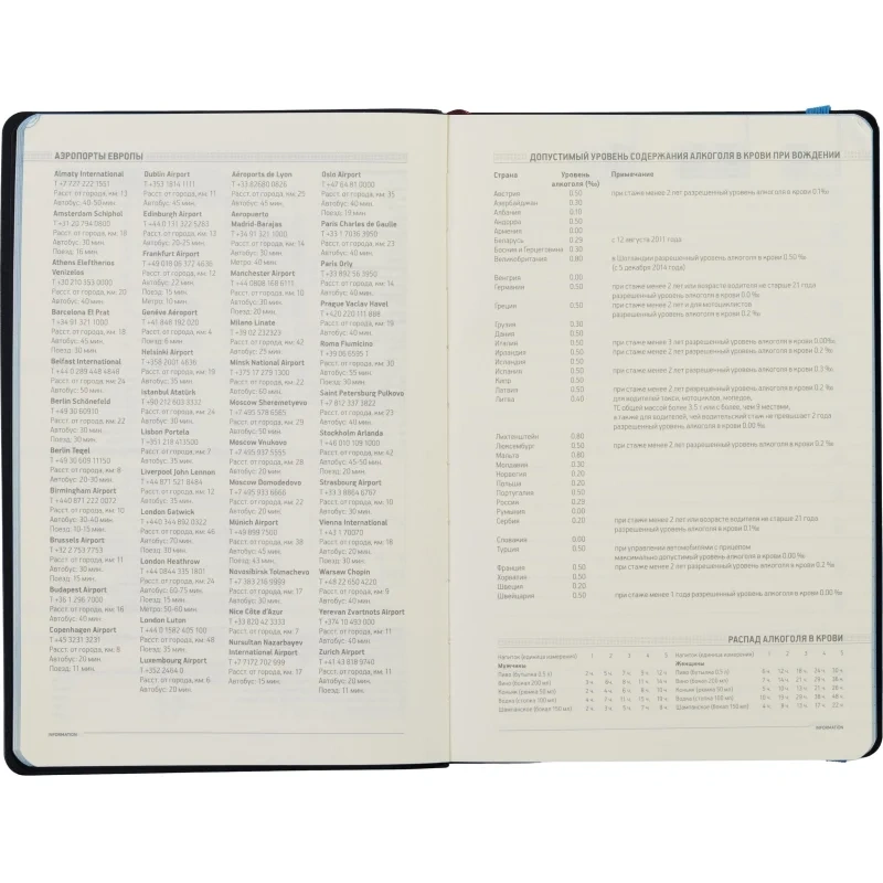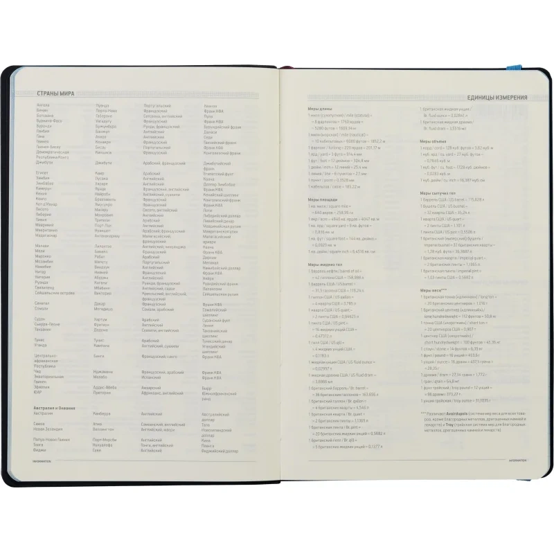 Ежедневник включает полезную справочную информацию, которая охватывает такие данные, как личные данные, часовые пояса, международные телефонные коды, размеры одежды, автомобильные коды, штрих-коды, энергетическая ценность продуктов, расход калорий, национальные праздники и другие. Последние восемь листов являются отрывными и дополнены микроперфорацией для удобного отрыва.