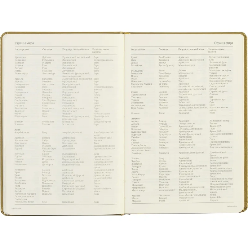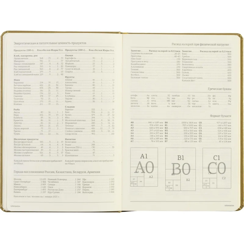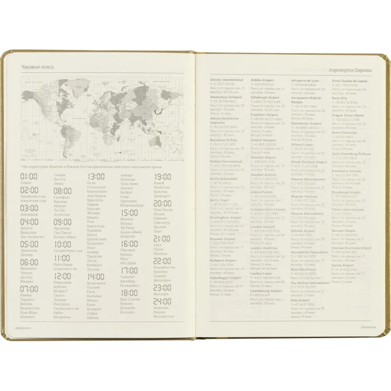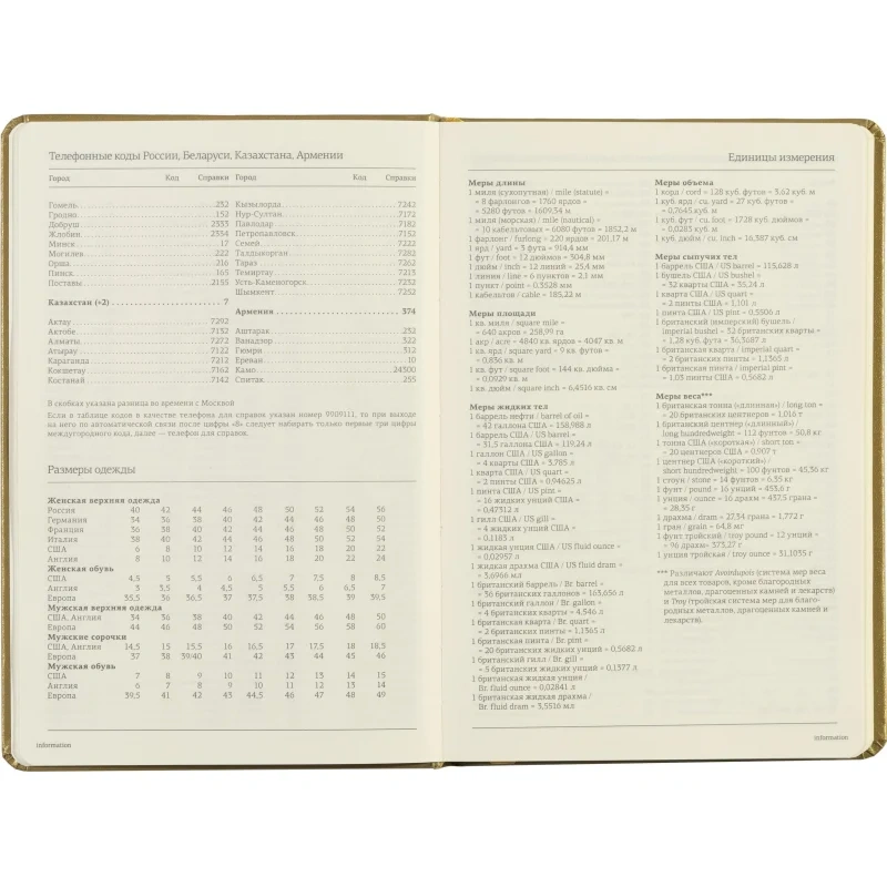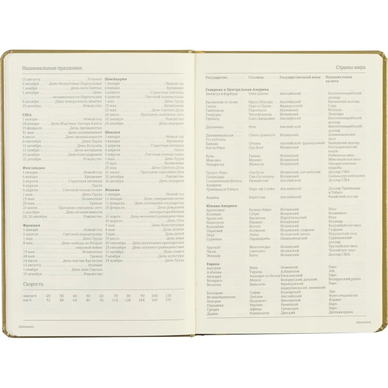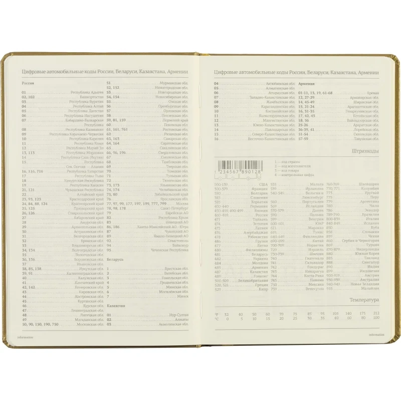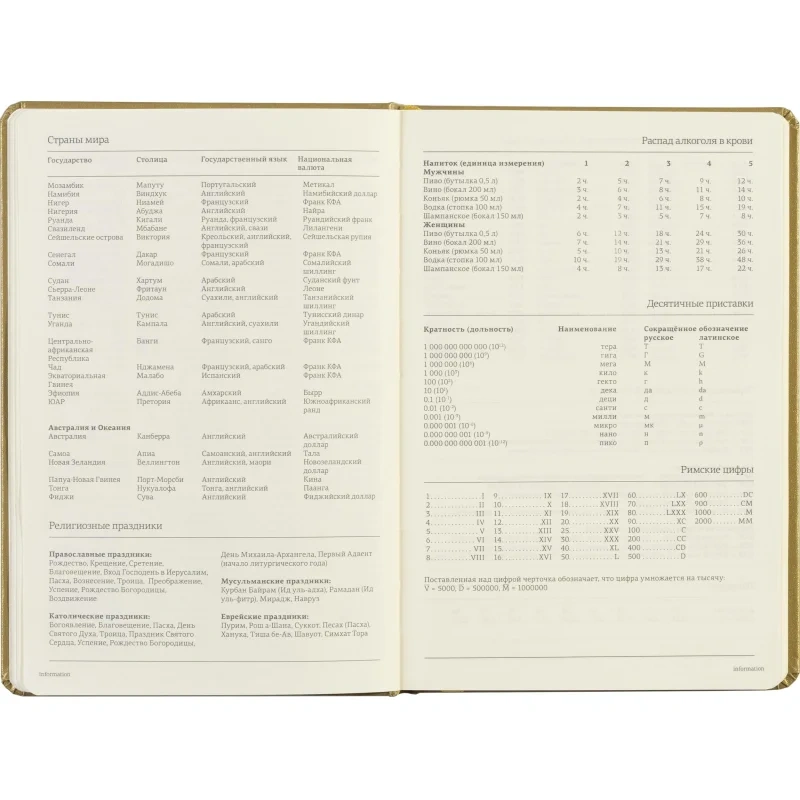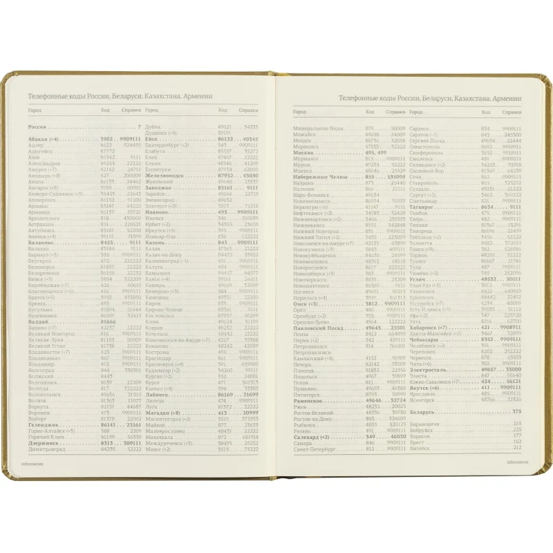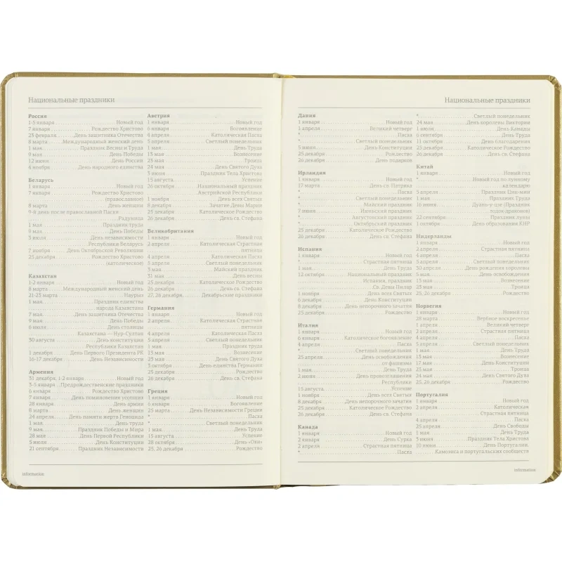Ежедневник включает обширную справочную информацию на 16 страницах, охватывающую такие важные данные, как личные данные, автомобильные коды, питательная ценность продуктов, расход калорий, национальные праздники, и другие полезные сведения. Это делает ежедневник не только удобным для записей, но и полезным инструментом для деловых людей.