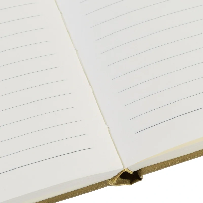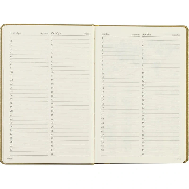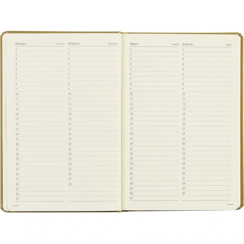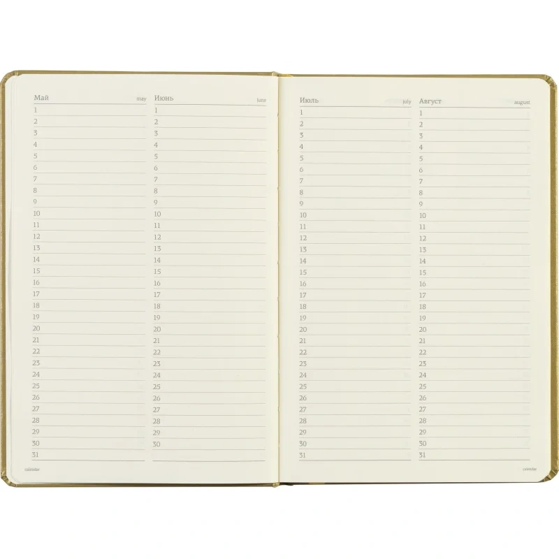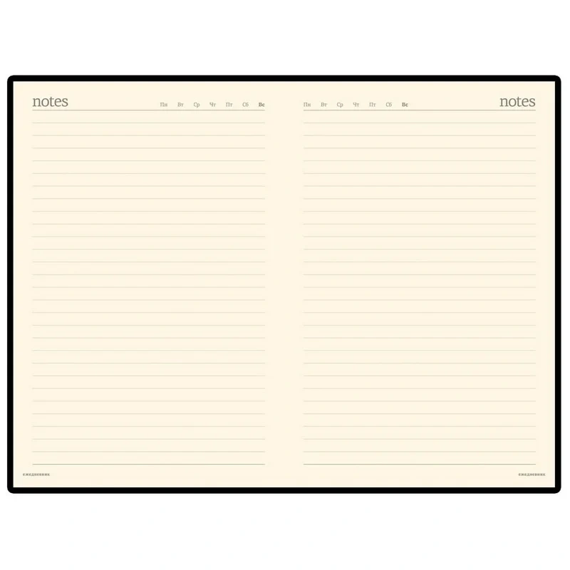 Внутренний блок состоит из 160 листов (320 страниц) бежевой офсетной бумаги плотностью 90 г/кв.м., с печатью в один цвет. Листы разлинованы в линейку для удобства записи, а недатированные страницы позволяют начинать использовать ежедневник в любой день года. Удобная закладка-ляссе помогает быстро находить нужную страницу.