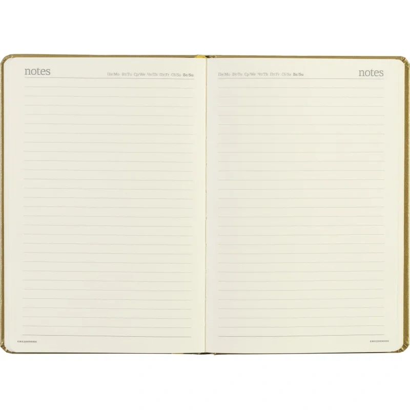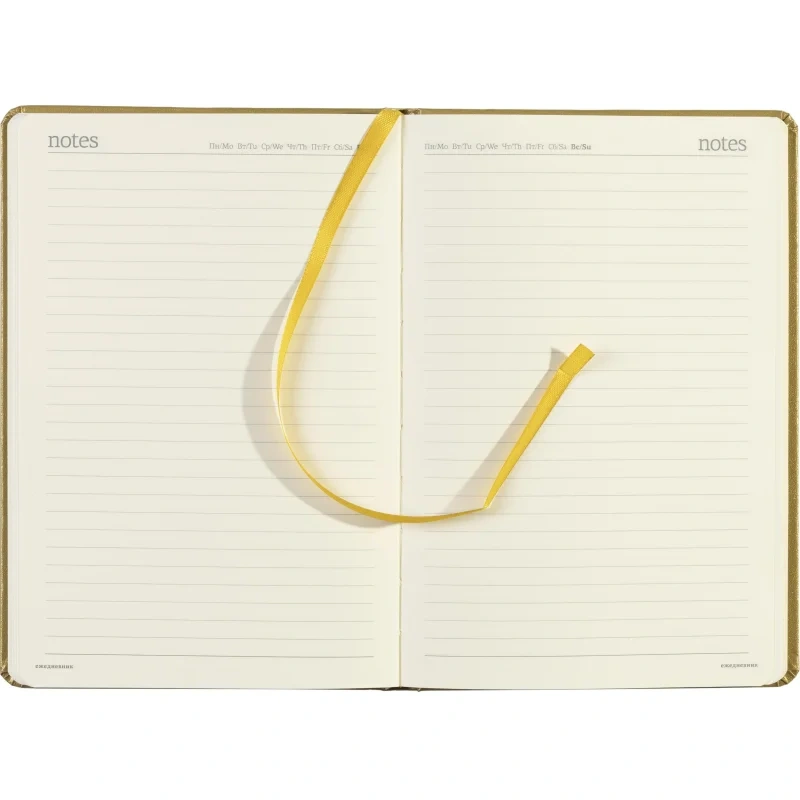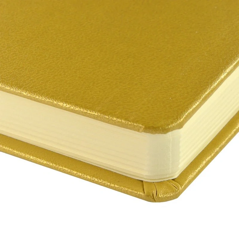 Ежедневник с твёрдой обложкой золотистого цвета из коллекции Megapolis — элегантный и функциональный аксессуар для деловых людей. Обложка выполнена из искусственной кожи с лёгким рельефом под кожу. Закруглённые уголки и возможность нанесения различных видов тиснения (фольгирование, шелкотрафаретная печать, горячее тиснение) добавляют ежедневнику индивидуальности.