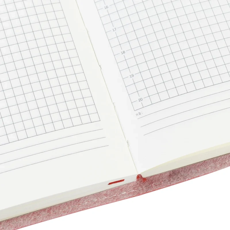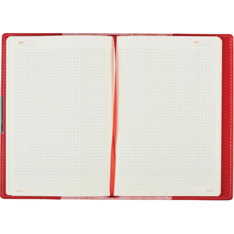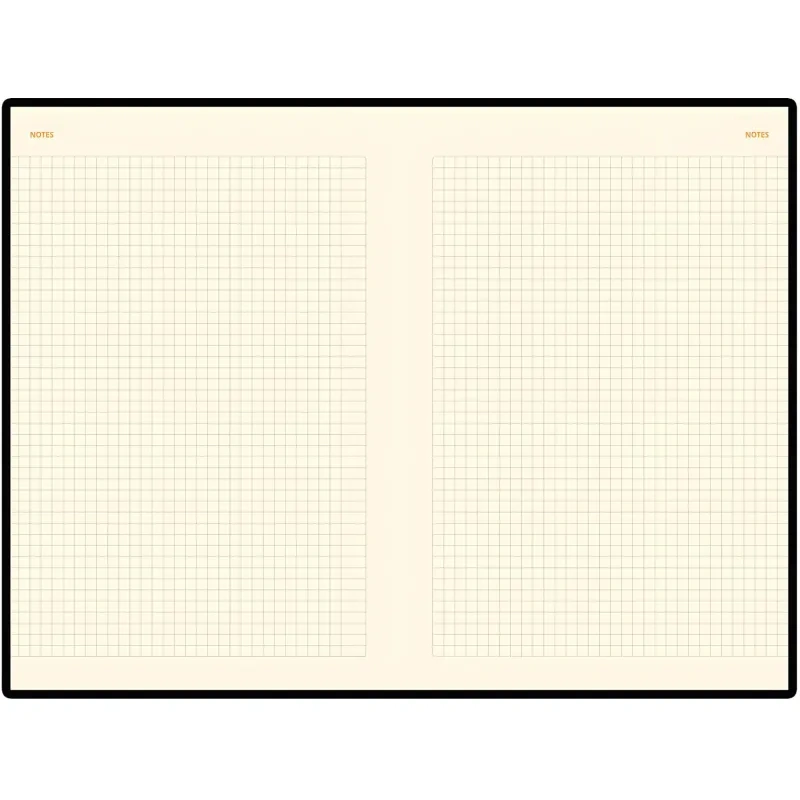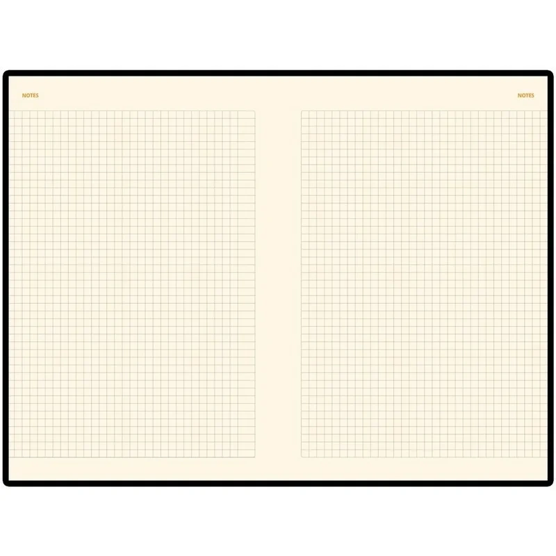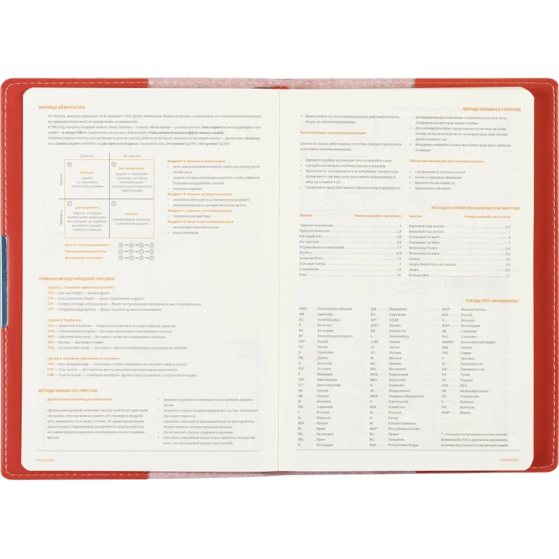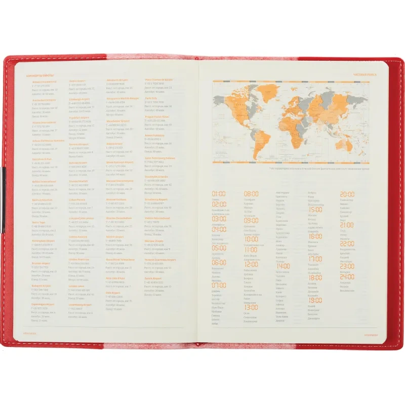 Внутренний блок состоит из 136 листов (272 страницы) бежевой бумаги плотностью 90 г/кв.м., с клеточной линовкой, что придаёт аккуратность записям. Листы недатированные, что позволяет начинать использовать ежедневник в любой день года и записывать столько информации, сколько нужно. На первых 18 страницах содержится справочная информация, охватывающая важные темы, такие как часовые пояса, аэропорты Европы, телефонные коды, размеры одежды и формат бумаги.