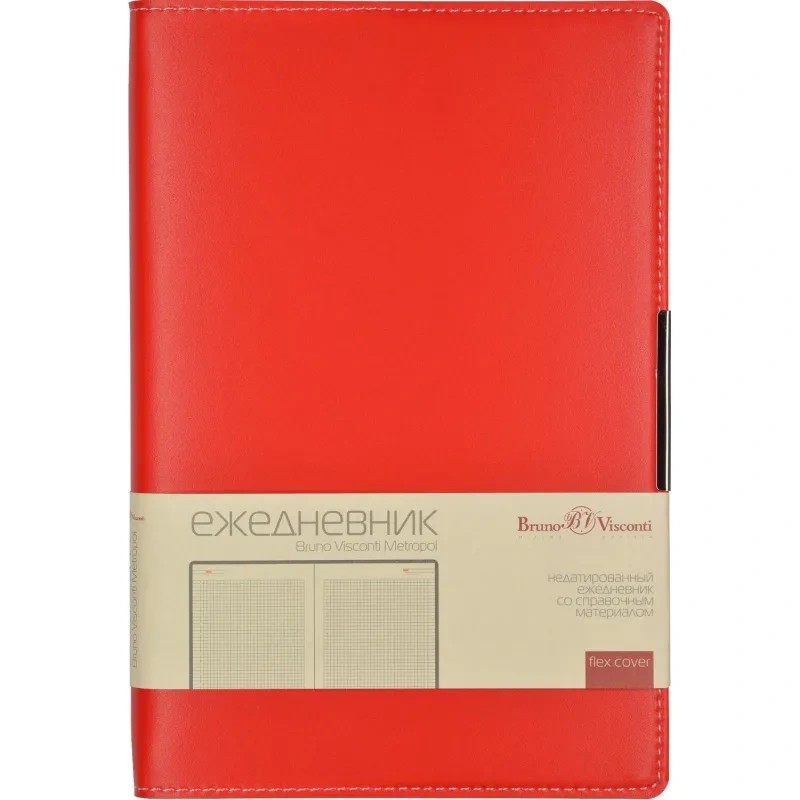 Ежедневник недатированный Bruno Visconti Metropol — искусственная кожа А5 136 листов красный. Ежедневник с гибкой обложкой красного цвета из коллекции Metropol — стильный и функциональный аксессуар для делового человека. Обложка выполнена из высококачественного переплётного материала с контрастной строчкой белыми нитками по периметру, а ляссе в цвет обложки добавляет удобства при использовании. Стильный металлический шильдик и модный форм-фактор делают его отличным выбором для современного профессионала.