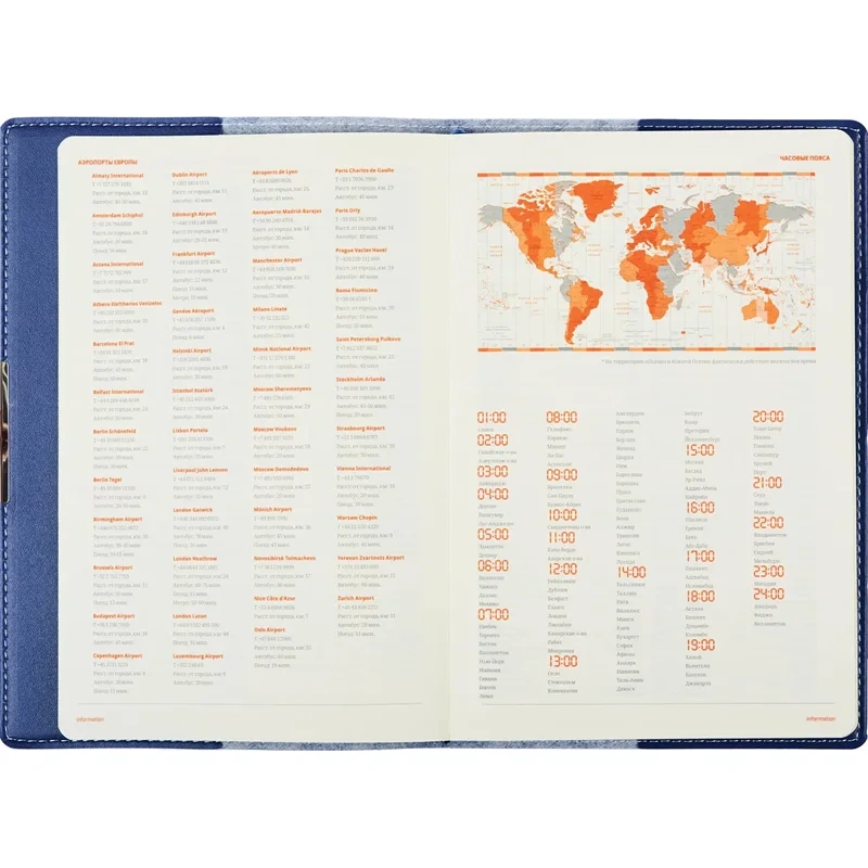 Внутренний блок состоит из 136 листов (272 страницы) бежевой офсетной бумаги плотностью 90 г/кв.м., с клеточной линовкой. На первых 18 страницах размещена справочная информация, охватывающая такие важные темы, как часовые пояса, аэропорты Европы, телефонные коды, размеры одежды, формат бумаги и другие полезные сведения.