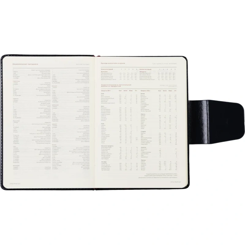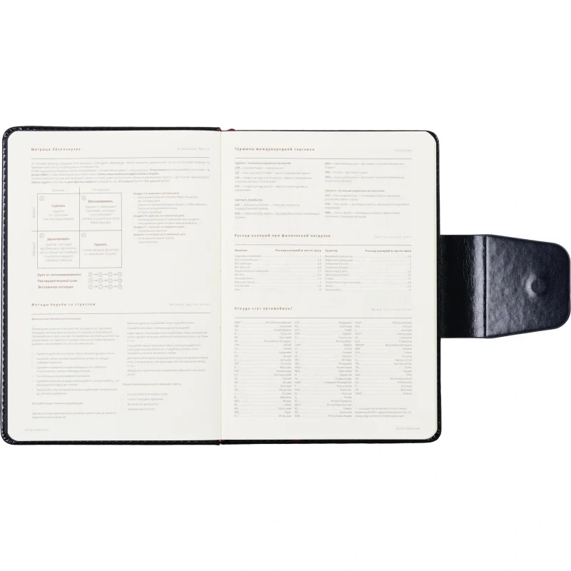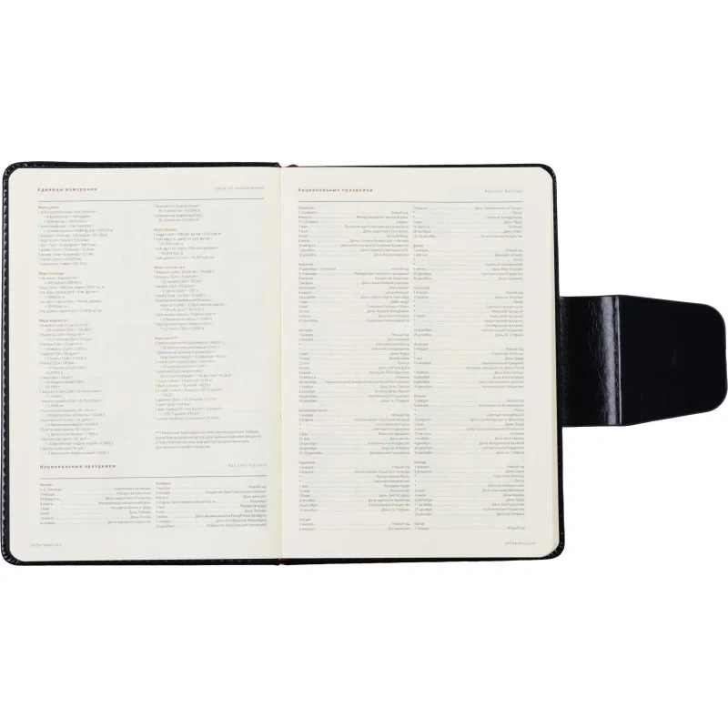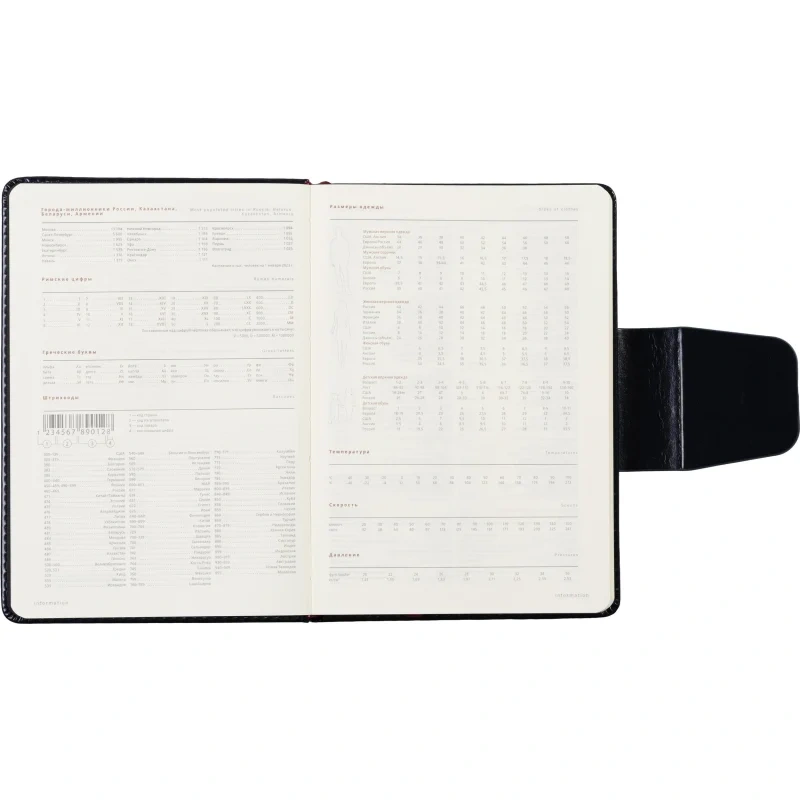 Кроме того, ежедневник включает 21 страницу справочной информации в начале блока, охватывающей важные сведения, такие как часовые пояса, размеры одежды, международные телефонные коды и другие полезные данные.