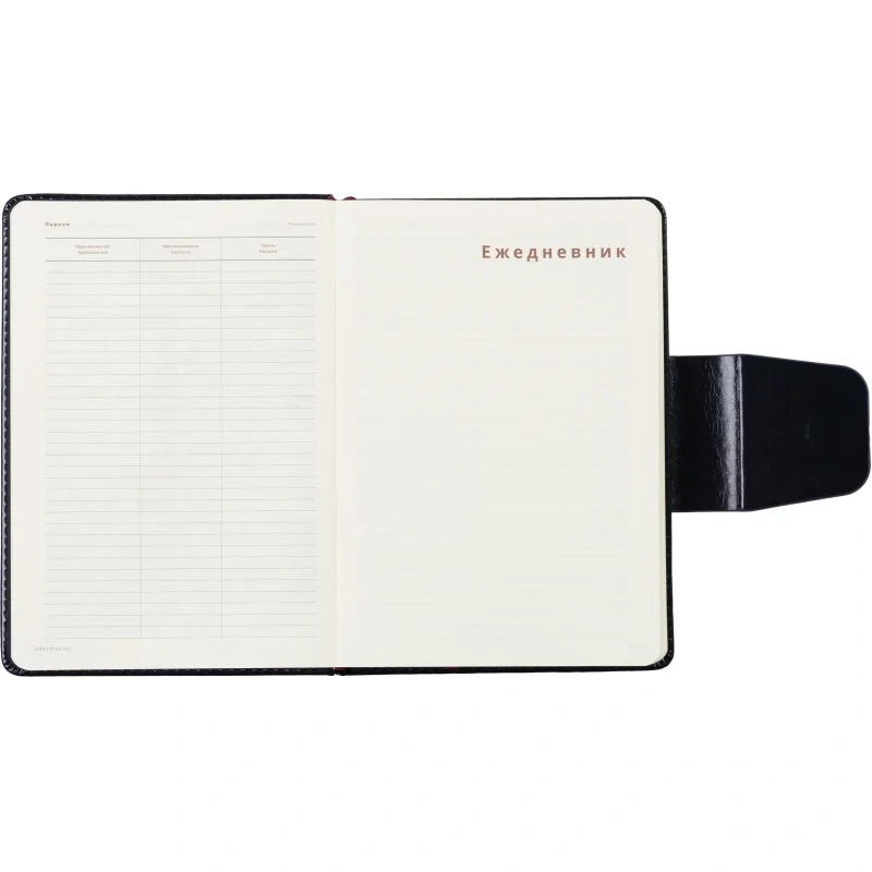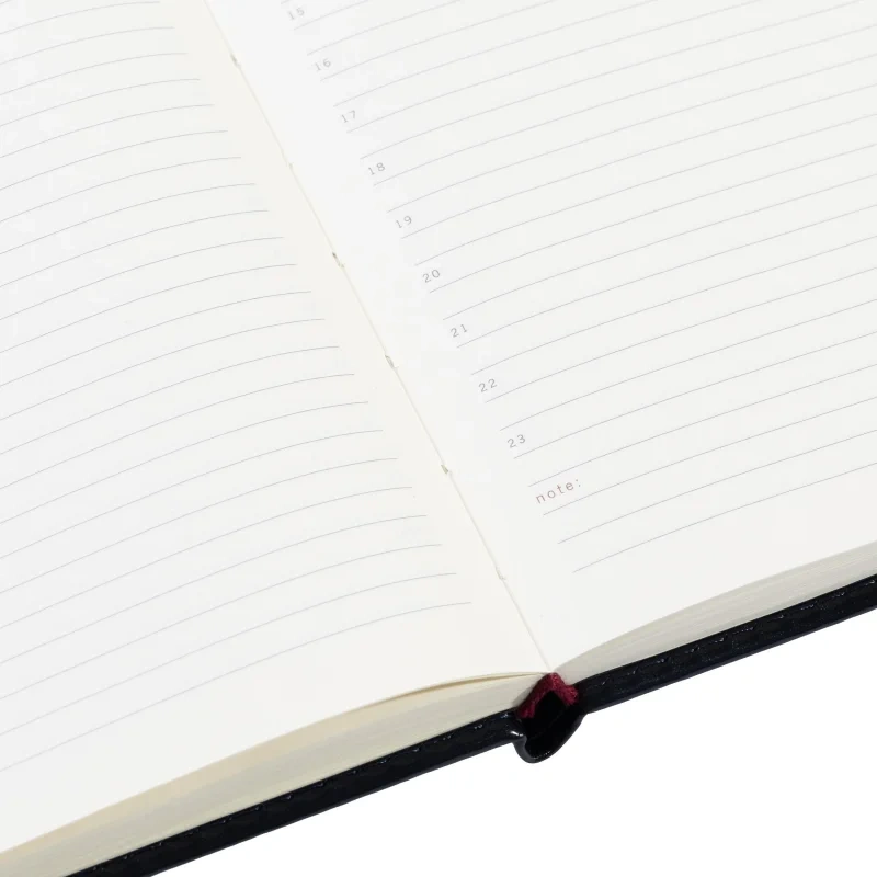 Внутренний блок состоит из 160 листов (320 страниц) бежевой офсетной бумаги плотностью 90 г/кв.м. с линейкой. Листы недатированные, что позволяет начать использовать ежедневник в любой день года. В комплект входит ляссе для удобства поиска нужной страницы.