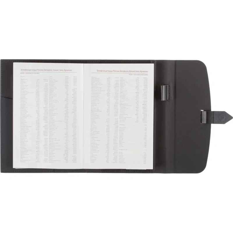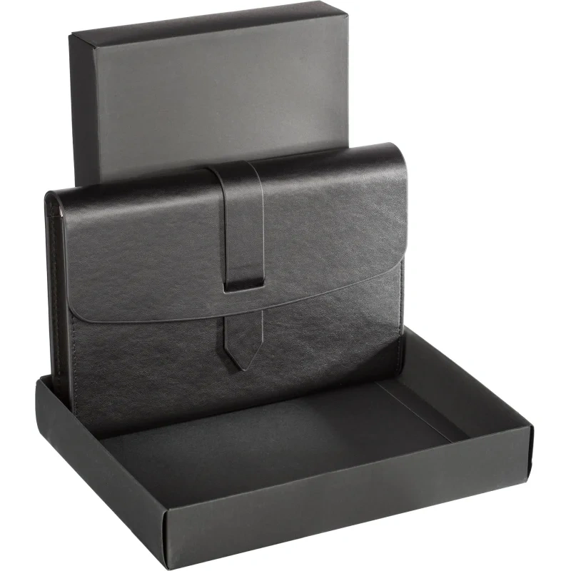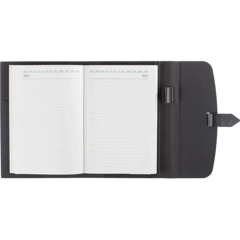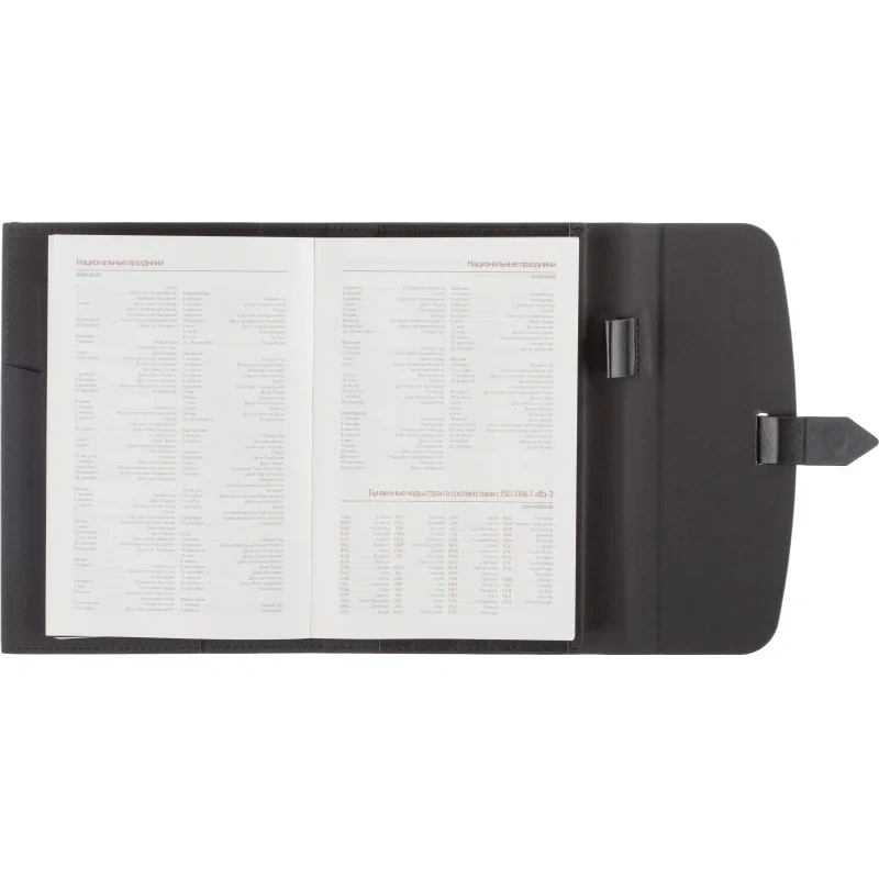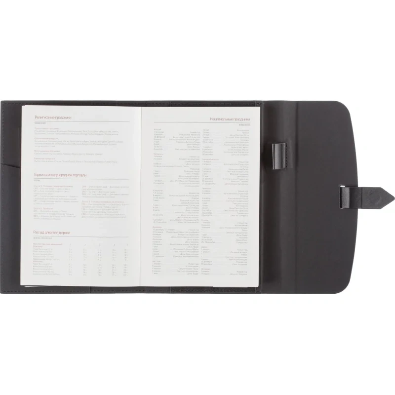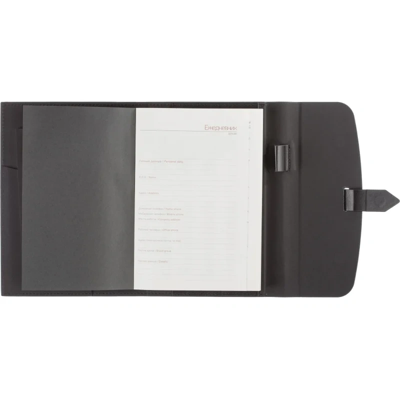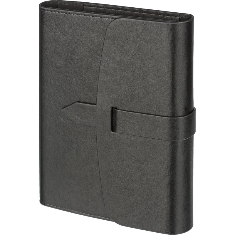 Ежедневник формата A5 с твёрдой обложкой чёрного цвета, выполненной из искусственной кожи, станет идеальным выбором для деловых людей. Внутренний блок состоит из 136 листов (272 страницы) тонированной офсетной бумаги плотностью 90 г/кв.м. с линейкой. Печать выполнена в два цвета.