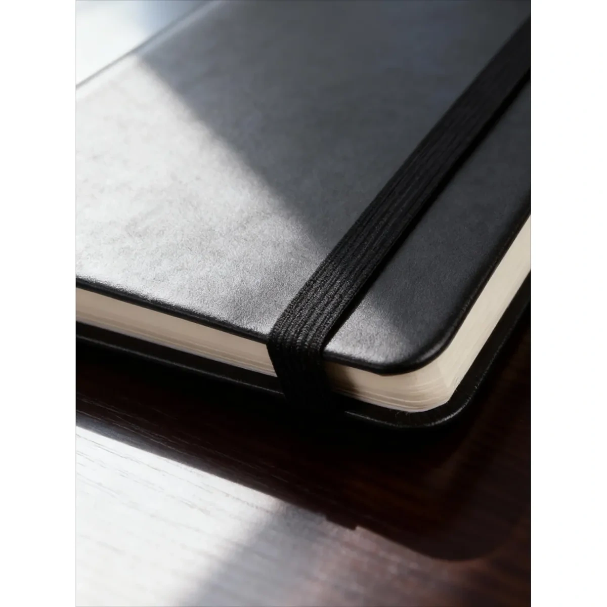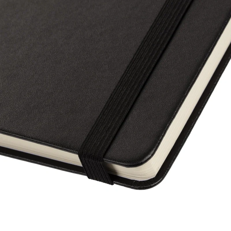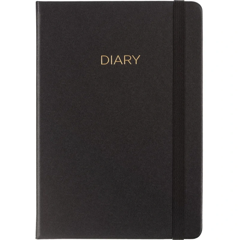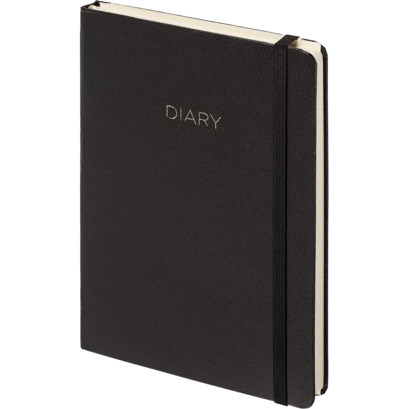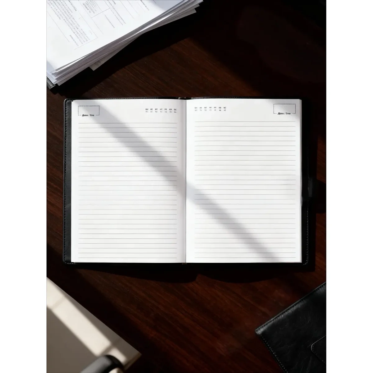 Ежедневник формата A5 предназначен для повседневного планирования и ведения записей. Изделие выполнено в вертикальной ориентации и имеет размер 140×200 мм. Твёрдая обложка из искусственной кожи чёрного цвета оформлена в однотонном стиле и выполнена с тиснением фольгой. Для фиксации предусмотрена эластичная резинка-держатель, позволяющая удерживать обложку в закрытом положении.