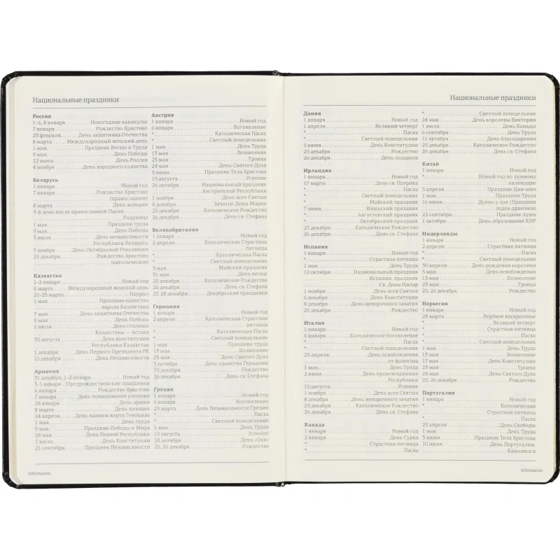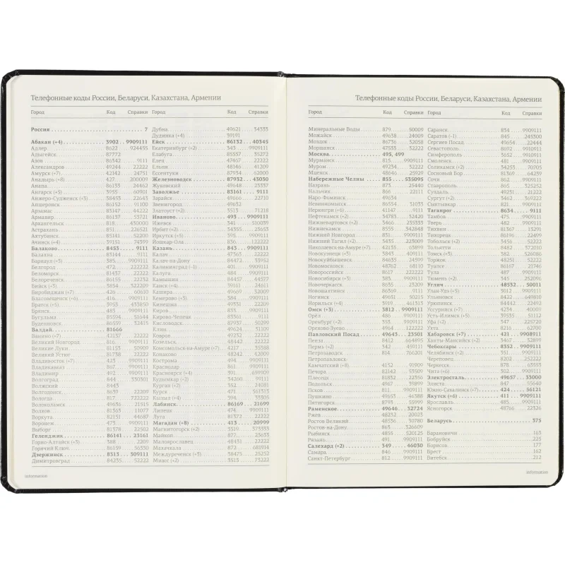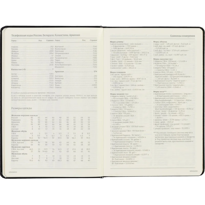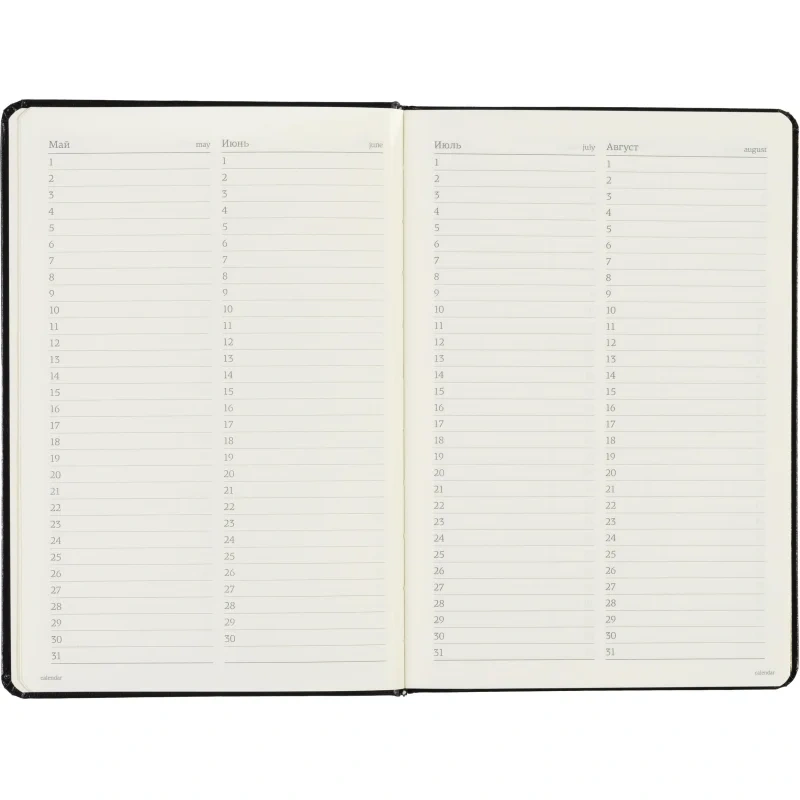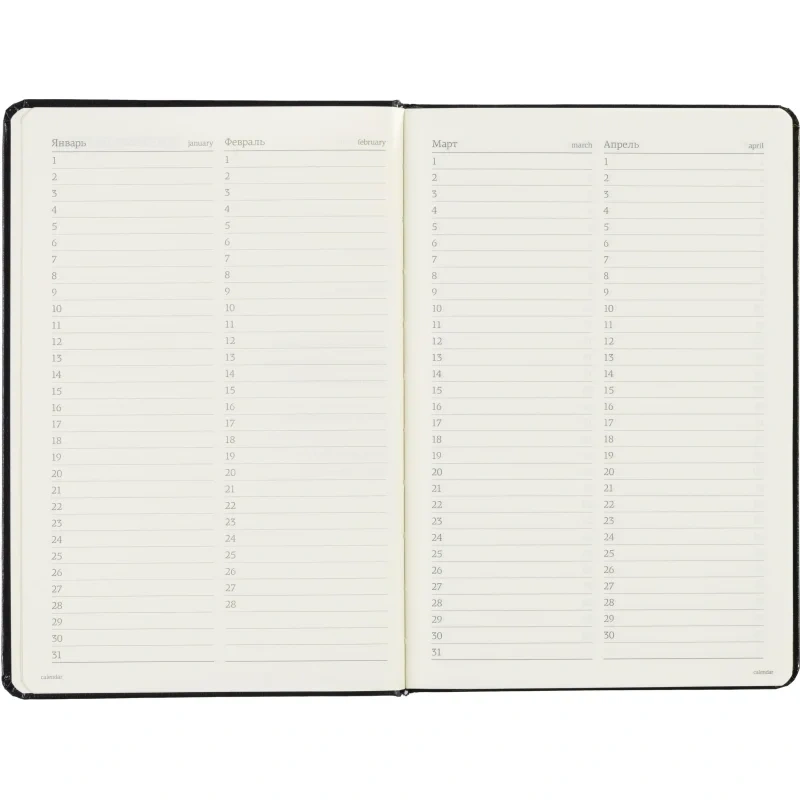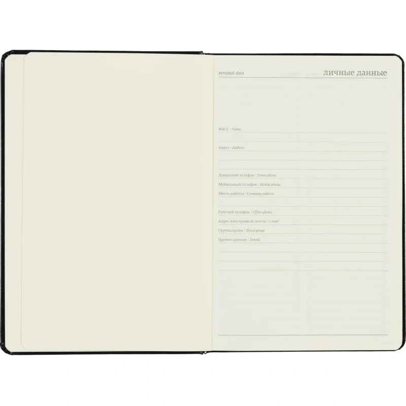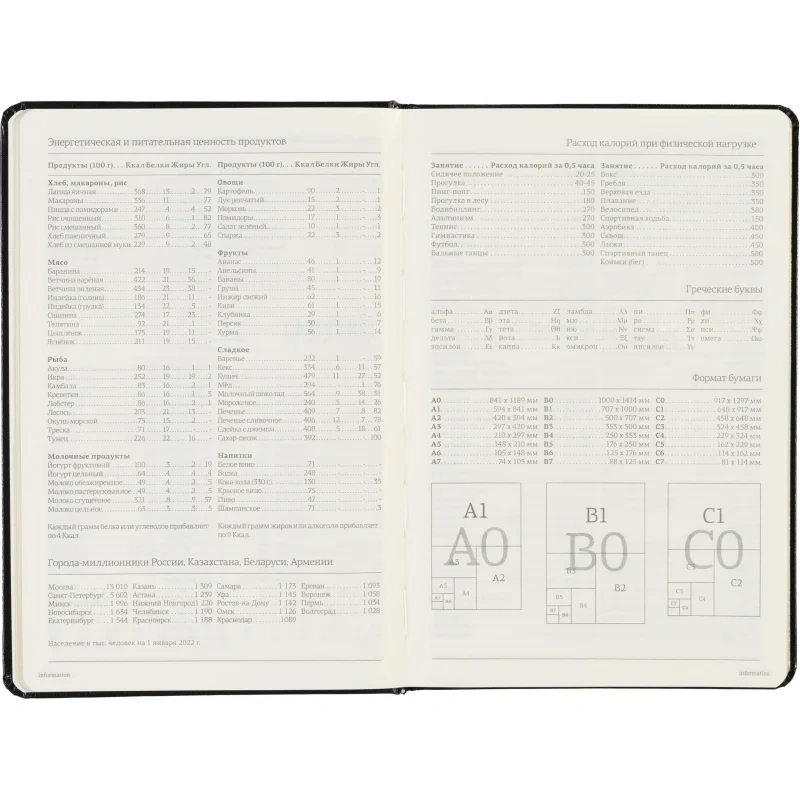 Ежедневник формата А5 с чёрной обложкой из искусственной кожи, выполненной в стиле натуральной кожи с лёгким рельефом. Обложка украшена золотым обрезом, капталом и ляссе в цвет обложки. Внутренний блок состоит из 320 страниц тонированной бежевой бумаги плотностью 70-90 г/кв.м., с линейкой. 16 страниц справочной информации включают телефонные и автомобильные коды, праздники, единицы измерения, калории, таблицы соответствия размеров и другие полезные сведения. В конце ежедневника размещены отрывные листы с микроперфорацией.