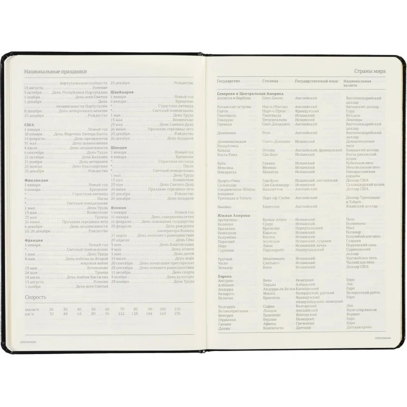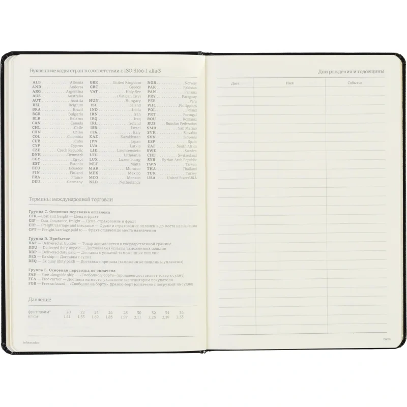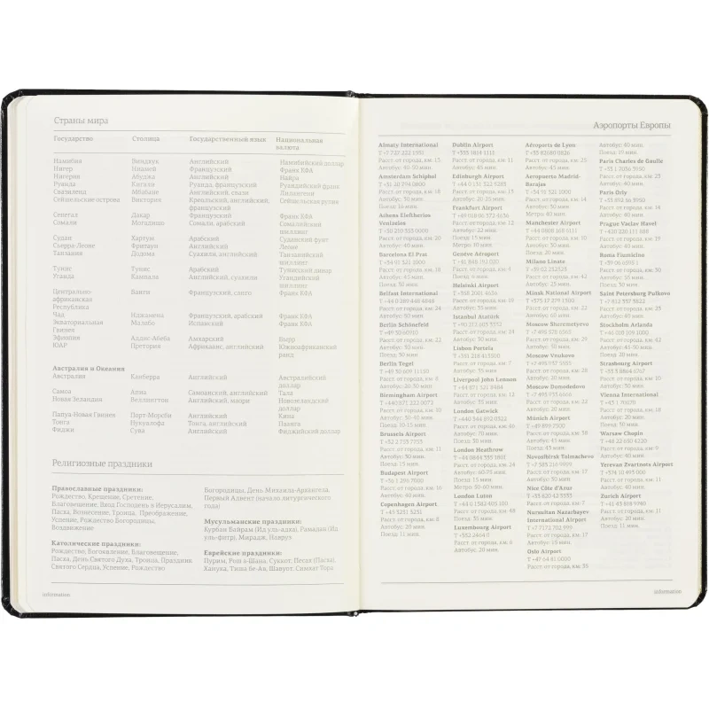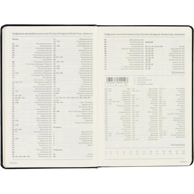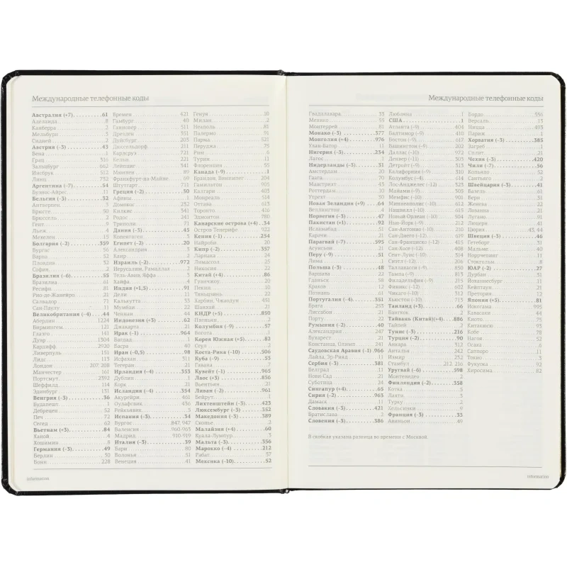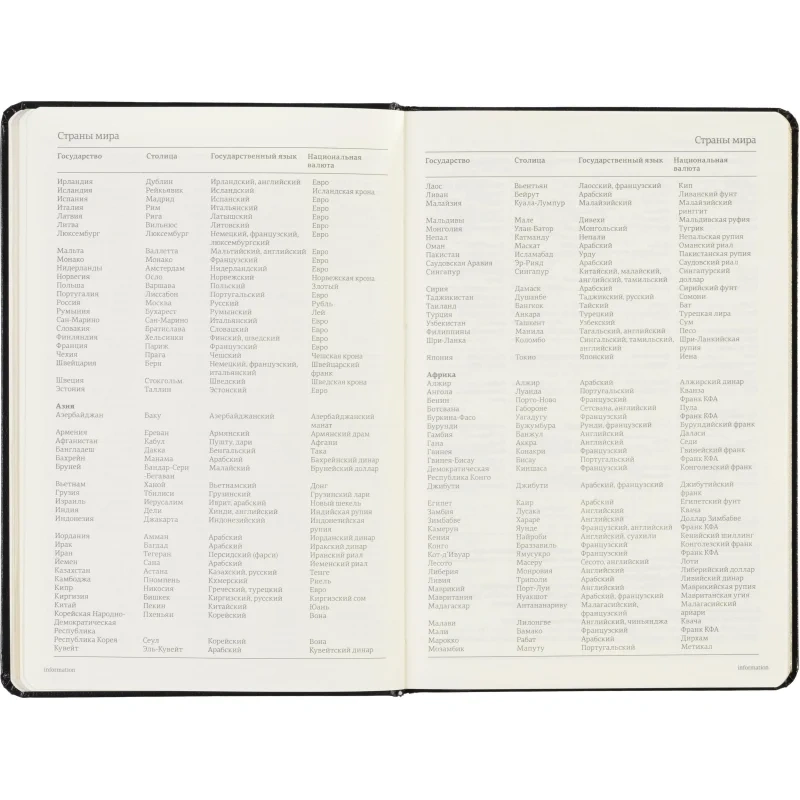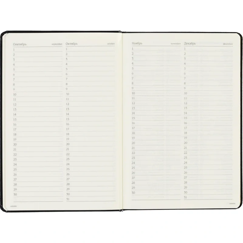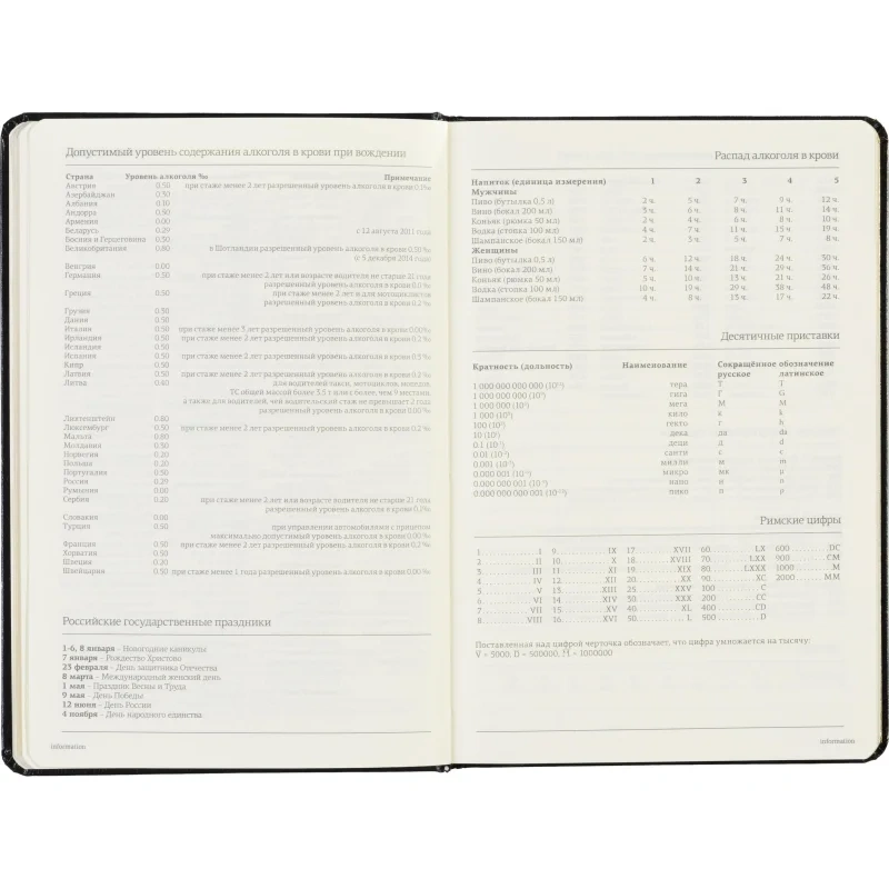 Ежедневник формата А5 с чёрной обложкой из искусственной кожи, выполненной в стиле натуральной кожи с лёгким рельефом. Обложка украшена золотым обрезом, капталом и ляссе в цвет обложки. Внутренний блок состоит из 320 страниц тонированной бежевой бумаги плотностью 70-90 г/кв.м., с линейкой. 16 страниц справочной информации включают телефонные и автомобильные коды, праздники, единицы измерения, калории, таблицы соответствия размеров и другие полезные сведения. В конце ежедневника размещены отрывные листы с микроперфорацией.