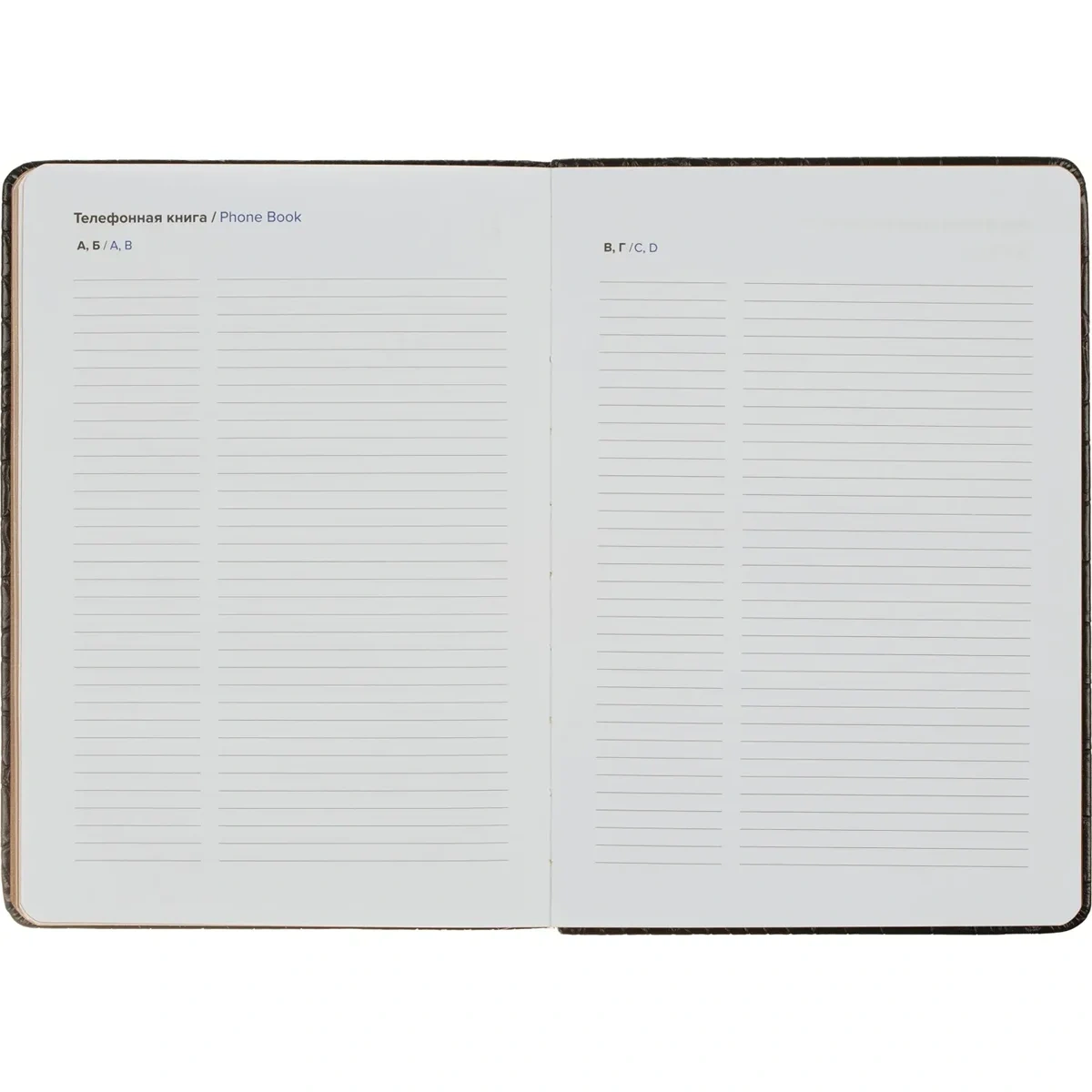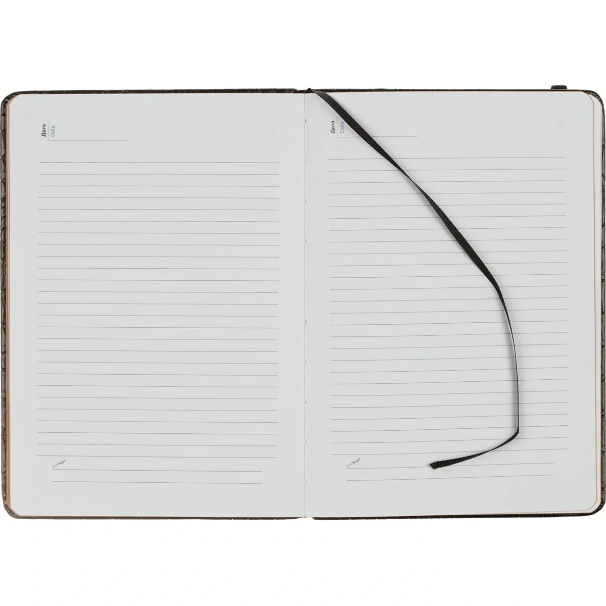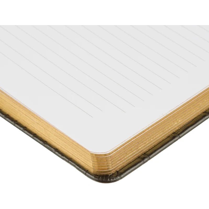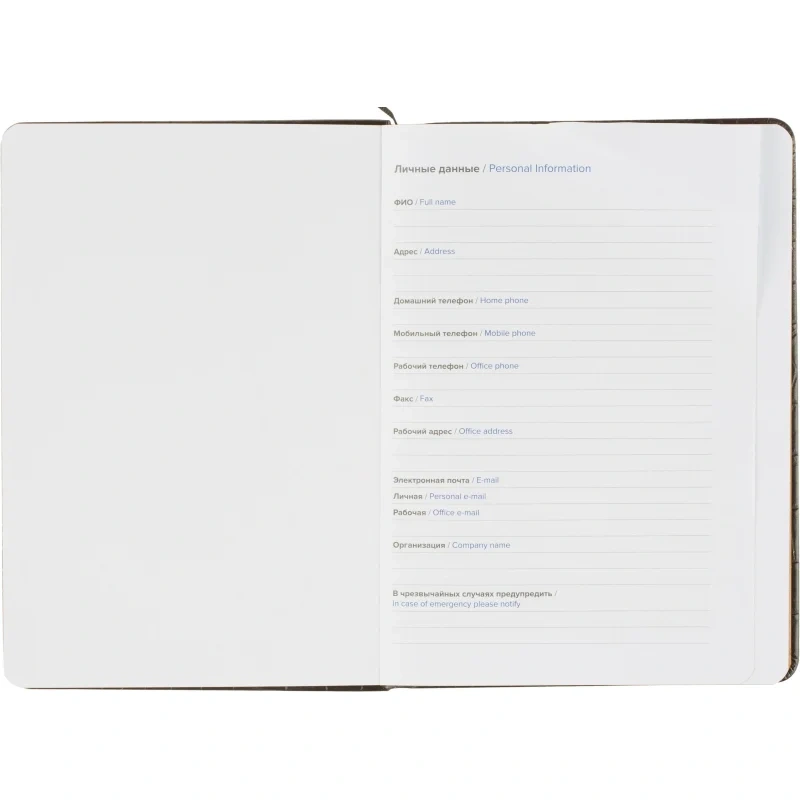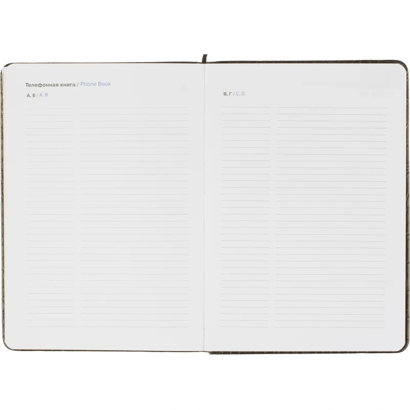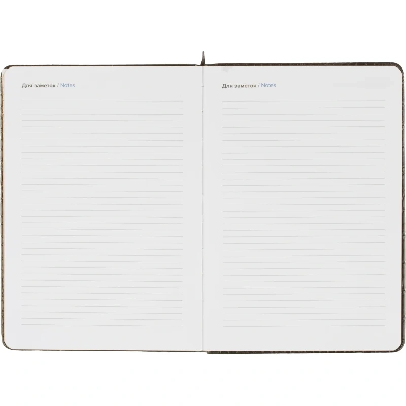 Внутренний блок включает 136 листов (272 страницы) белой офсетной бумаги плотностью 70 г/кв.м, напечатанной в две краски. Страницы разлинованы в линейку и не датированы, что позволяет вести записи в произвольной форме без привязки к календарю. Блок прошит ниткошвейным способом, листы имеют скругленные углы, перфорация и вырубка отсутствуют. Вшитое тканевое ляссе упрощает навигацию внутри ежедневника.