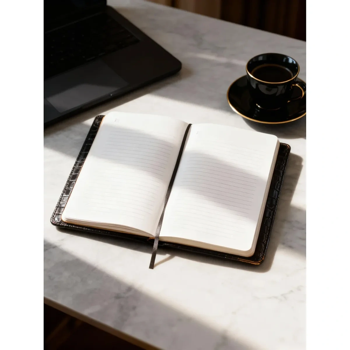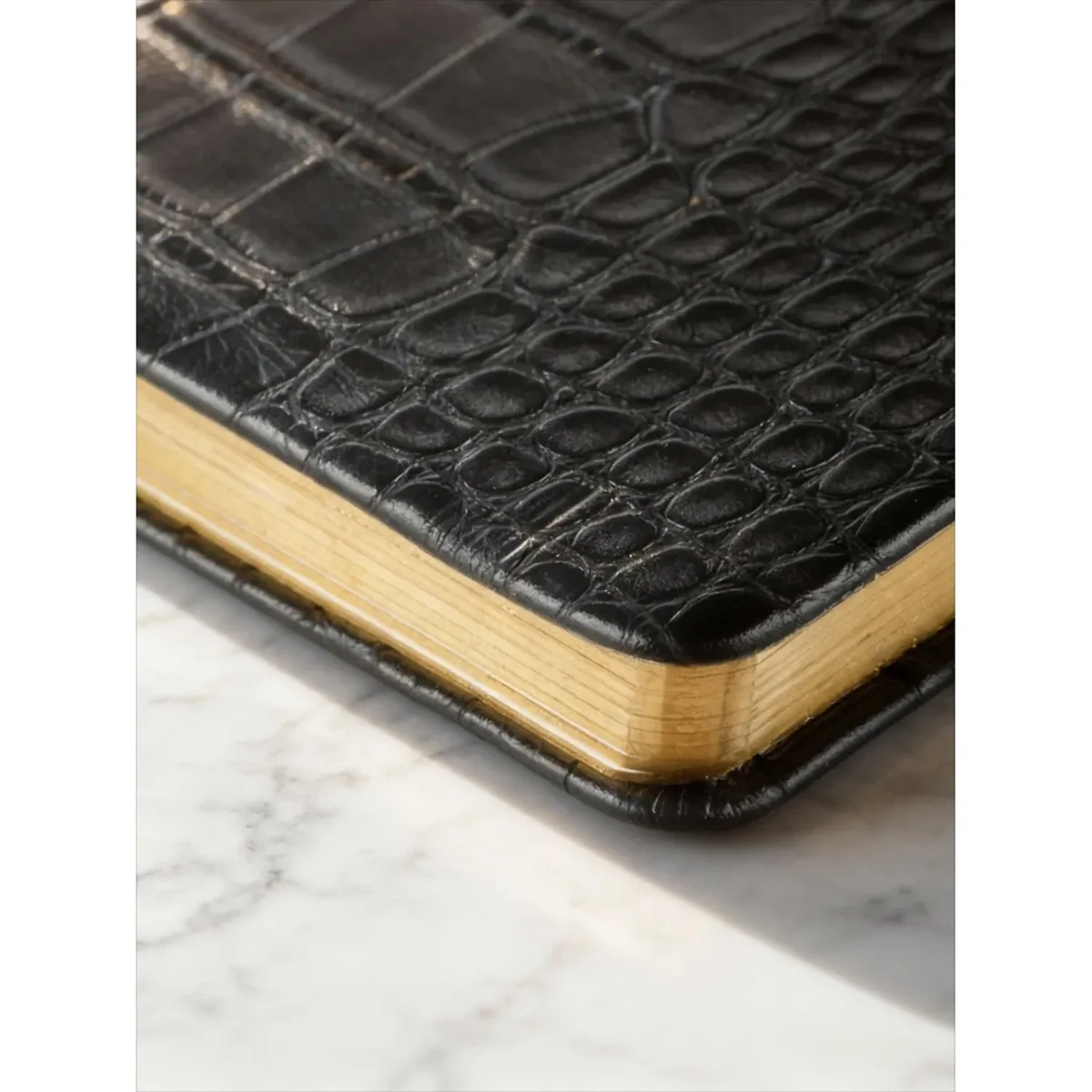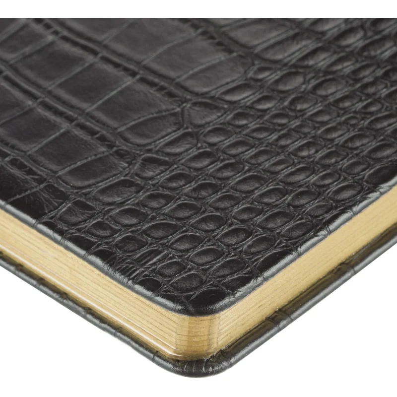 Твердая обложка из искусственной кожи черного цвета оформлена в лаконичном стиле с использованием тиснения фольгой, что подчеркивает его деловой характер. Для удобства предусмотрена фиксирующая резинка. Золотистый обрез придает изделию аккуратный и презентабельный вид.