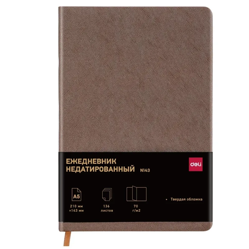 Ежедневник недатированный Deli Elegant искусственная кожа A5 136 листов коричневый (золотистый обрез)Ежедневник Deli Elegant формата A5 - это удобный и надёжный инструмент для ведения деловых и личных записей. Изделие имеет размер 143x210 мм и выполнено в вертикальной ориентации. Твёрдая обложка из искусственной кожи коричневого цвета устойчива к износу и защищает содержимое от влаги и деформации при транспортировке.Блок включает 136 листов белой офсетной бумаги плотностью 70 г/кв.м, отпечатанной в две краски. Страницы разлинованы в линейку и не имеют полей, что позволяет использовать всё доступное пространство для записей. Ежедневник не датирован, подходит для свободного планирования. Переплёт выполнен ниткошвейным способом, обеспечивающим надёжность и долгий срок службы. Листы имеют скруглённые углы, что помогает сохранить аккуратность внешнего вида и предотвратить повреждения. Дополнительным визуальным акцентом служит золотистый цветной обрез, повышающий узнаваемость изделия в сумке или рюкзаке.В ежедневнике нет календаря и дополнительных разделов, что делает его универсальным для любых задач. Также отсутствуют петля под ручку, внутренний карман, подарочная упаковка и фиксирующая резинка. Для удобства предусмотрено ляссе.
