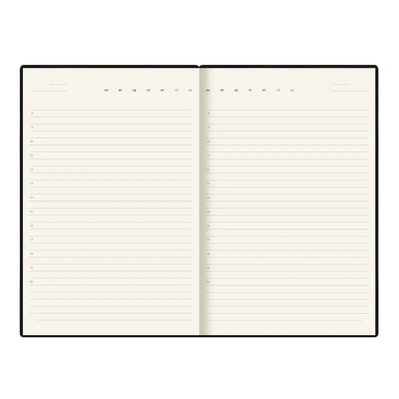 Внутренний блок включает 136 листов белой офсетной бумаги плотностью 70 г/кв.м, отпечатанной в две краски. Бумага гладкая, подходит для письма шариковыми, гелевыми и капиллярными ручками. Страницы оформлены в линейку, не содержат полей и не датированы, что делает ежедневник универсальным для записи в любое время года. Крепление выполнено ниткошвейным способом, что гарантирует надёжность при частом раскрытии. Листы имеют прямые углы, без скругления. Для удобства предусмотрено ляссе.