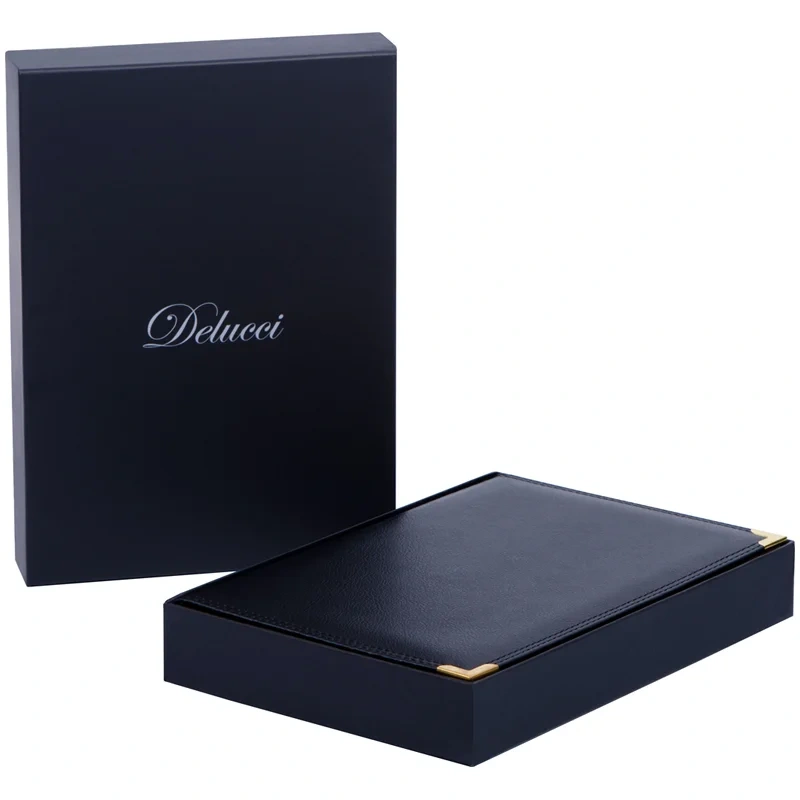 Изысканный недатированный ежедневник Delucci формата А5 из первоклассной фактурной экокожи и поролоновой прослойкой – идеальный презент для руководителя. Черная обложка прошита двойной строчкой, её дополняют золотые металлические уголки и необычный золотой срез блока. Внутренний блок состоит из 160 листов кремовой бумаги повышенной плотности 100 г/м? с пантонной печатью в 2 краски. Недатированный ежедневник Delucci представлен в размере 150 на 215 мм.