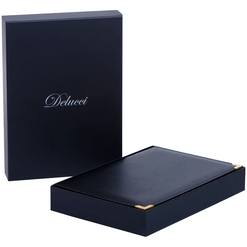 Изысканный недатированный ежедневник Delucci формата А6 из первоклассной рельефной экокожи и поролоновой прослойкой – идеальный презент для руководителя. Черная обложка прошита двойной строчкой, её дополняют золотые металлические уголки и необычный золотой срез блока. Внутренний блок состоит из 160 листов кремовой бумаги повышенной плотности 100 г/м? с пантонной печатью в 2 краски. Недатированный ежедневник Delucci представлен в размере 115 на 160 мм.