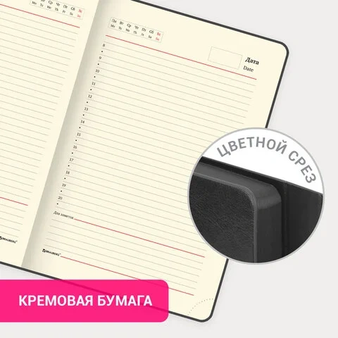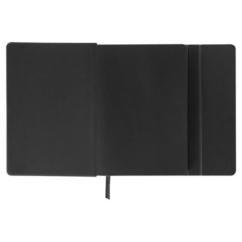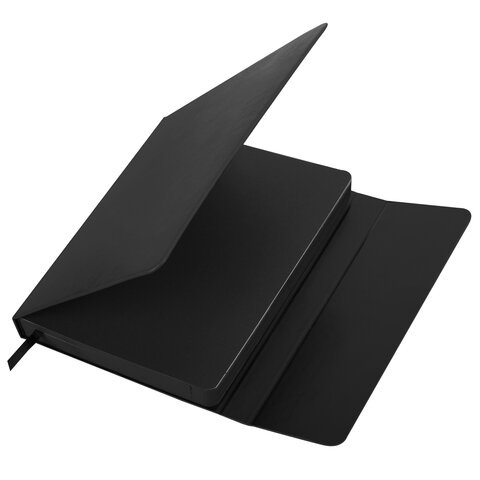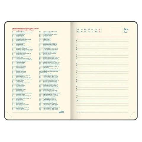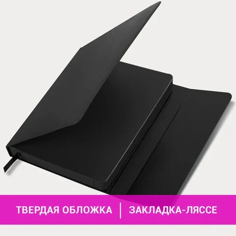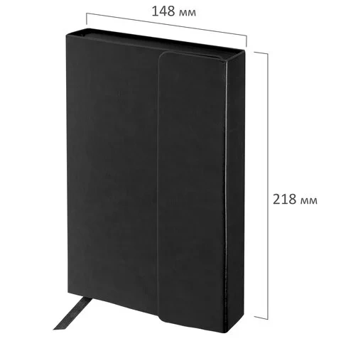 Внутренний блок включает 160 листов тонированной бумаги плотностью 70 г/м2. Каждая страничка имеет перфорированный угол. Благодаря стандартному формату А5 ежедневник удобно использовать как в офисе, так и на выездных деловых встречах. Интегральная обложка, выполненная в классическом черном цвете и стилизованная под гладкую кожу, фиксируется магнитным клапаном, поэтому ежедневник не откроется в сумке или портфеле и страницы не помнутся. Подходит для горячего тиснения. Срез и форзац ежедневника окрашены в цвет обложки, что придает ему особый шарм. Дополнением является закладка-ляссе, с помощью которой при необходимости можно быстро открыть ежедневник на нужной странице. Помимо прочего ежедневник снабжен обширным справочным материалом.